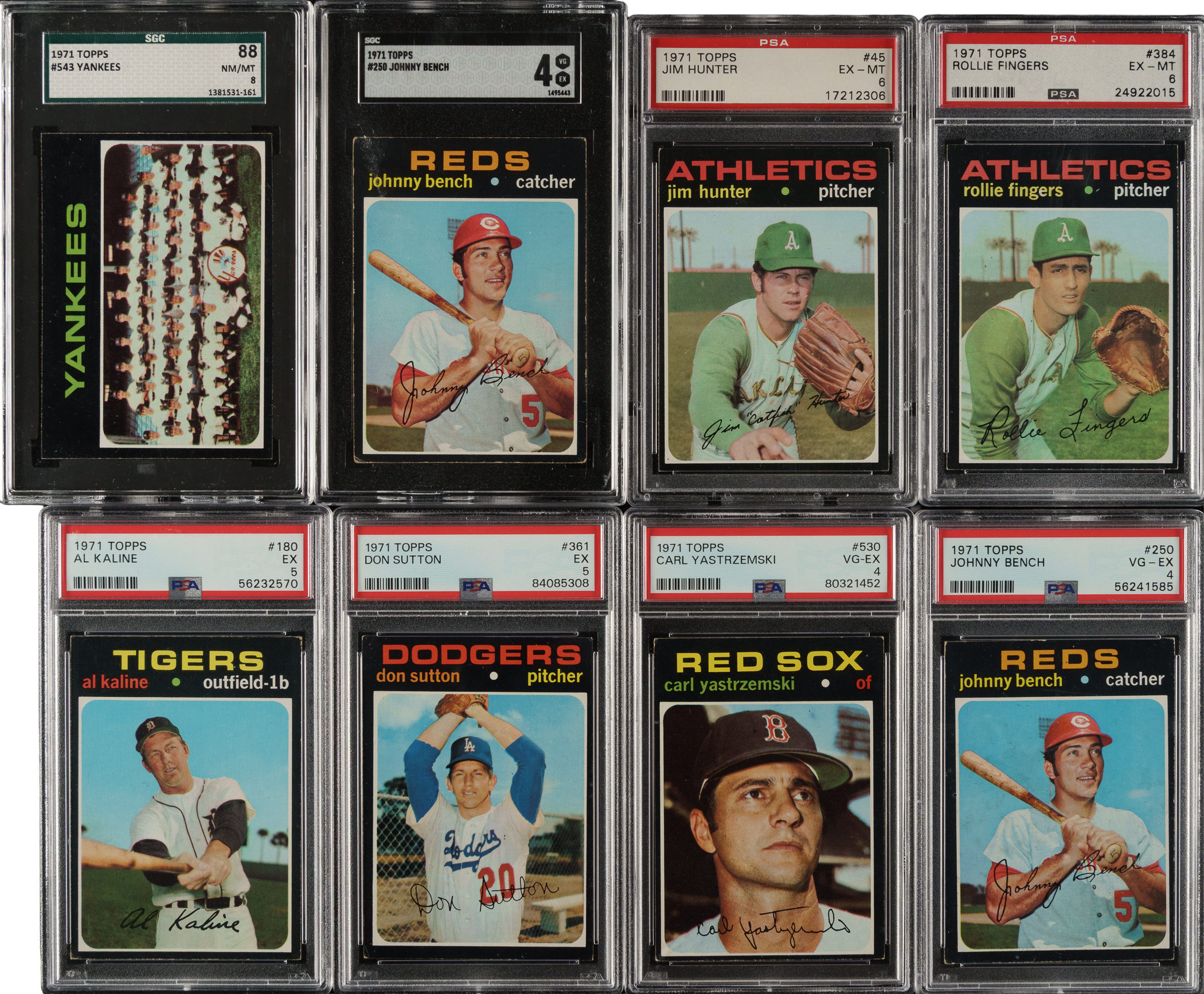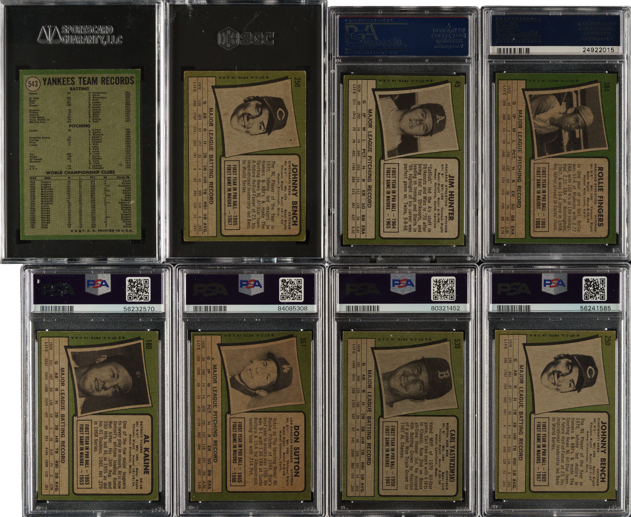 Collection of eight 1971 Topps Hall of Fame cards, featuring Cincinnati Reds, Boston Red Sox, and Detroit Tigers Hall of Famers Johnny Bench, Carl Yastrzemski and Al Kaline. Each card has been graded and encapsulated by PSA (6) and SGC (2). PSA Grading Composite: NM-MT 8 (1 card): #543 (SGC NM/MT 88). EX-MT 6 (2 cards): #45 Hunter and 384 Fingers. EX 5 (2 cards): 180 Kaline and 361 Sutton. VG-EX 4 (3 cards): Two #250 Bench (one SGC) and 530 Yastrzemski. Total: 8 cards.