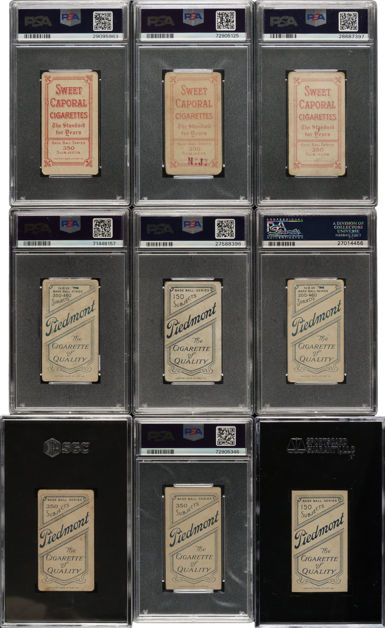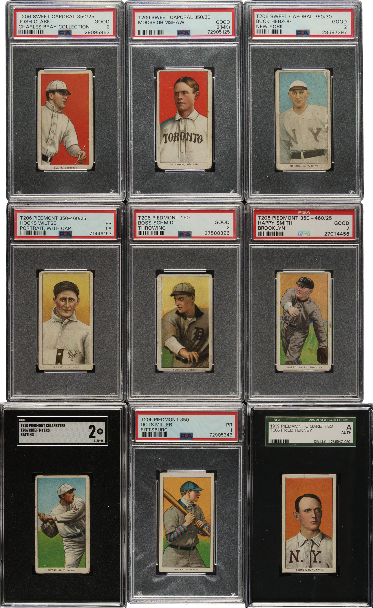 Collection of nine 1909-1911 T206 White Border cards, each graded and encapsulated by PSA (7) or SGC (2). PSA Grading Composite: GOOD 2 (6 cards): Clark (Charles Bray Collection), Grimshaw (MK), Herzog/New York, Myers/batting (SGC), Schmidt/throwing, and H. Smith/Brooklyn. FAIR 1.5 (1 card): Wiltse/portrait with cap. POOR 1 (1 card): Miller/Pittsburg. Authentic (1 card): Tenney (SGC). Total: 9 cards.