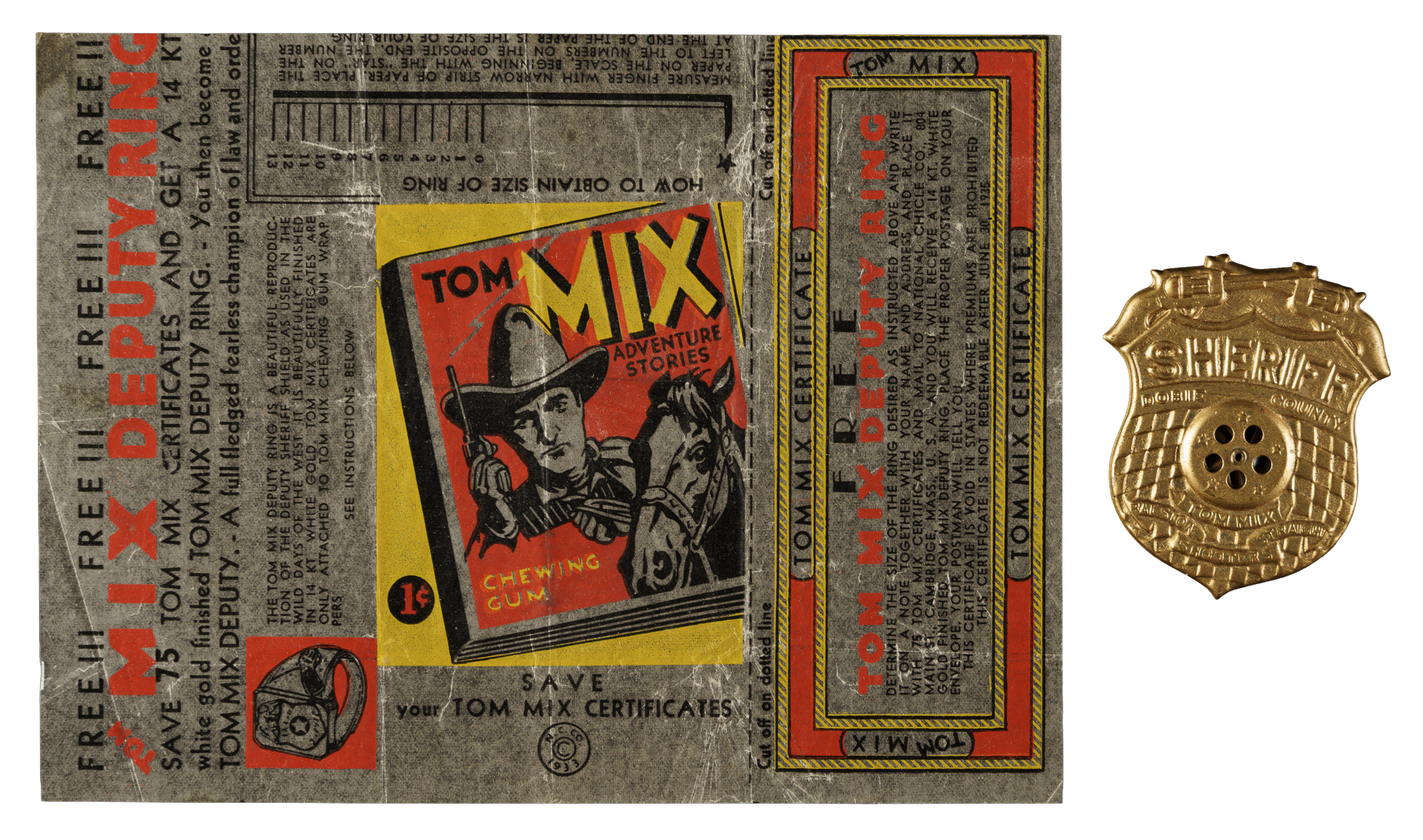Near-complete set of 46 "Tom Mix Adventure Stories" booklets issued by National Chicle in 1934, missing only #30 and 40 for completion. Condition is 41% Vg-Ex to Ex, 43% Gd to Vg, and 16% lesser. This is a very attractive and relatively high-grade set, especially for these somewhat fragile eight-page booklets which are so susceptible to damage. Several of the booklets present with slight as-issued "diamond cuts." The high-number booklets from Series 2 are very difficult to find. The set is accompanied by an original wax wrapper (missing a small piece, Fr), original company mailing envelope (Pr), and promotional plastic "sheriff" badge (Ex). Total: 49 items (46 booklets plus wrapper, envelope, and badge).