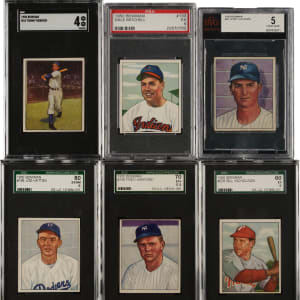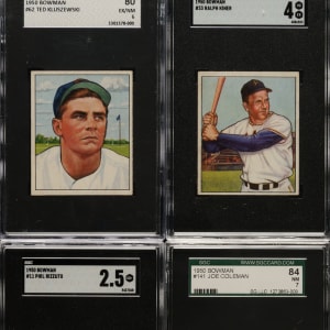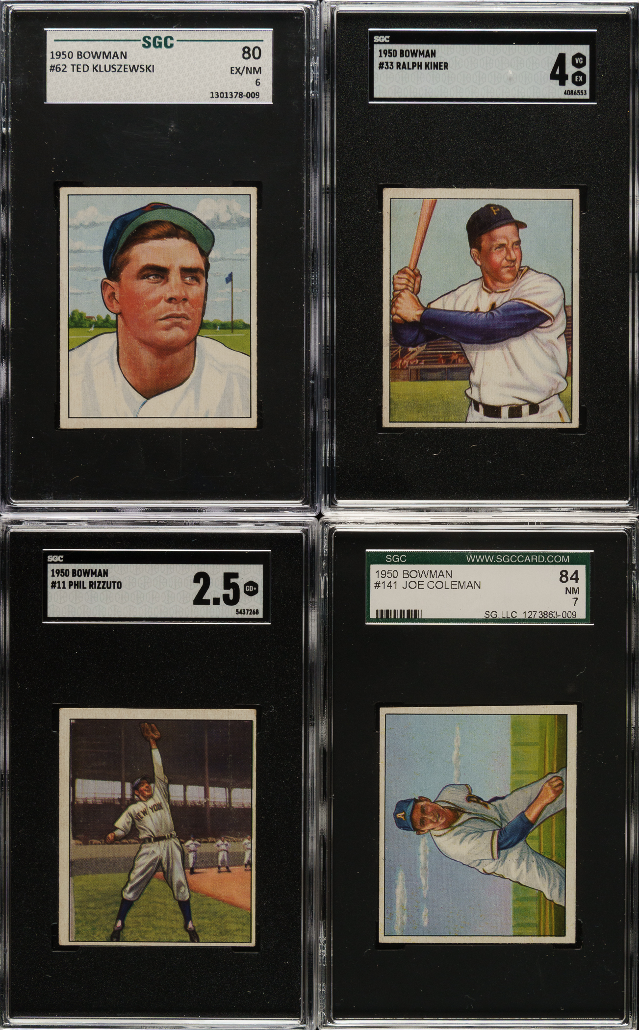 Collection of ten 1950 Bowman cards, featuring New York Yankees and Pittsburgh Pirates Hall of Famers Phil Rizzuto and Ralph Kiner. Each card has been graded and encapsulated by SGC (8), PSA (1) and BVG (1). SGC Grading Composite: NM 84 (1 card): #141. EX/NM 80 (2 cards): #62 and 166. EX+ 70 (1 card): #156. EX 60 (3 cards): #47 (BVG), 130 (PSA), and 228. VG/EX 4 (2 cards): #10 and 33 Kiner. GOOD+ 2.5 (1 card): #11 Rizzuto. Total: 10 cards. The size/weight of this item requires that there will be an additional shipping charge for this lot.