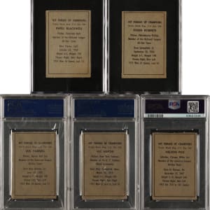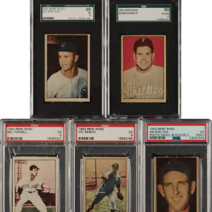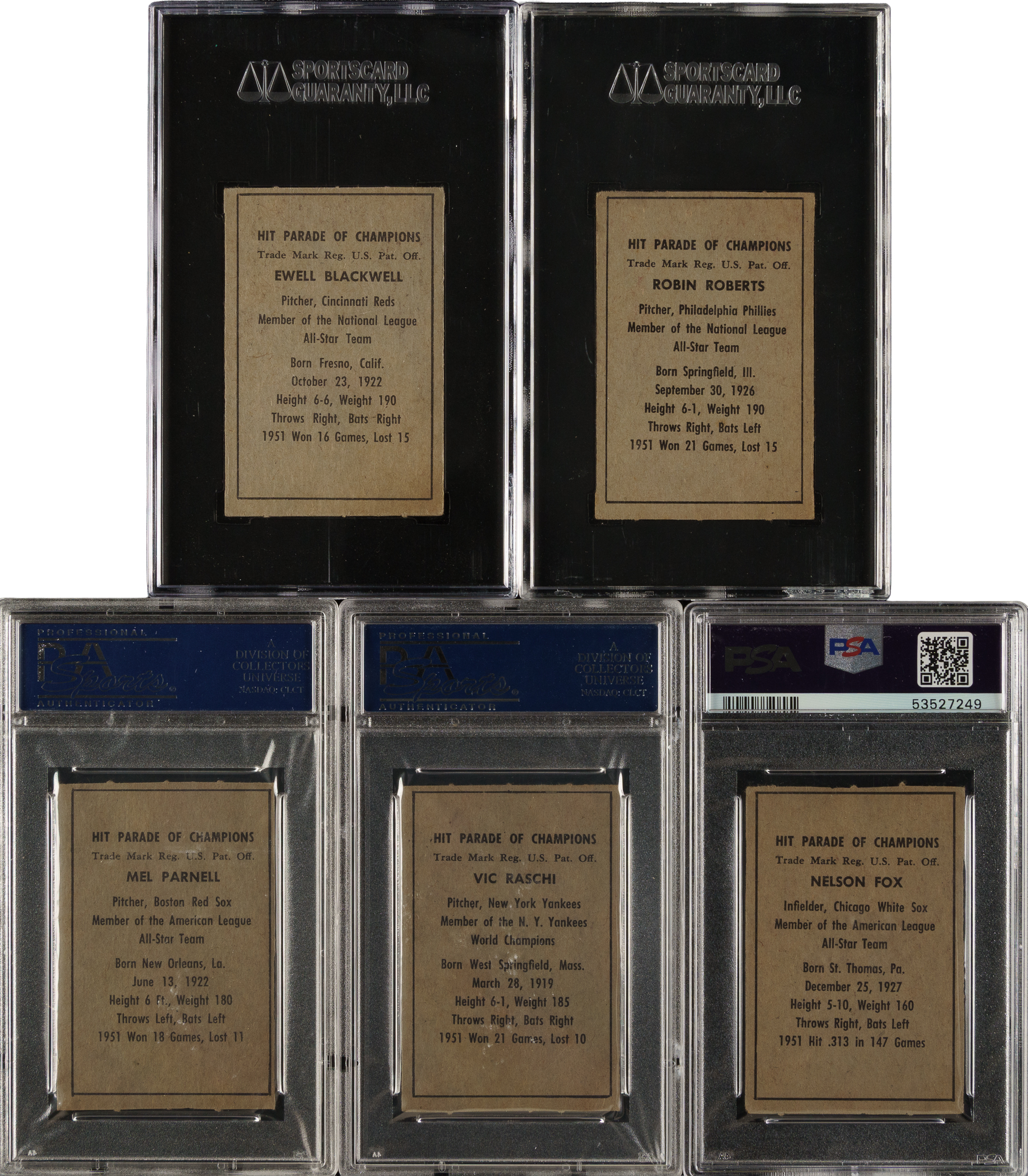 Collection of five 1952 Berk Ross cards, featuring Chicago White Sox and Philadelphia Phillies Hall of Famers Nelson Fox and Robin Roberts. Each card has been graded and encapsulated by PSA (3) or SGC (2). PSA Grading Composite: EX 5 (3 cards): Fox (SGC EX 60), Parnell, and Raschi. VG/EX 50 (1 card): Roberts. VG 3 (1 card): Fox/Photo Ewell Blackwell (MC). Total: 5 cards.