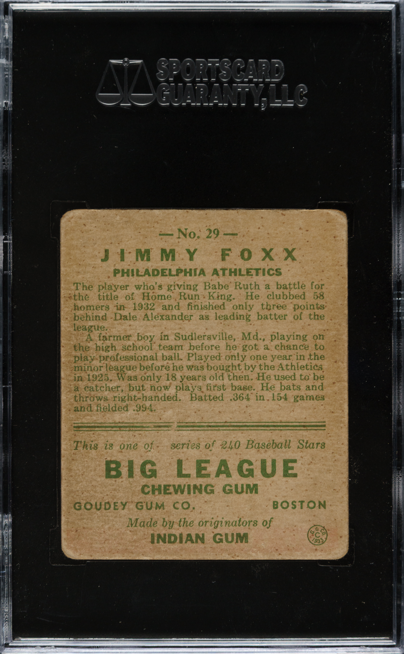 Graded VG 40 by SGC. Philadelphia Athletics Hall of Famer Jimmie Foxx.
