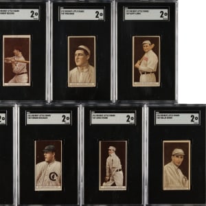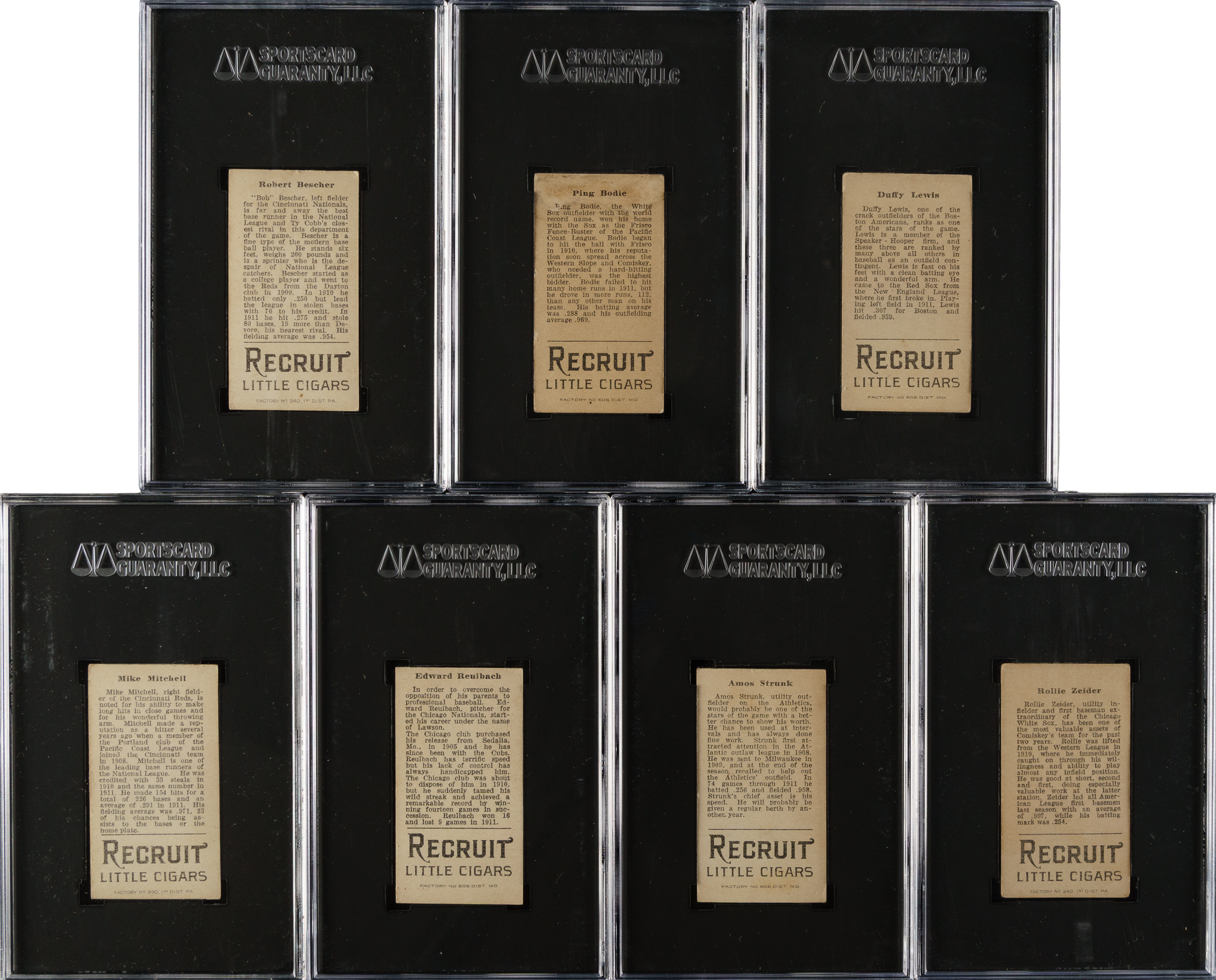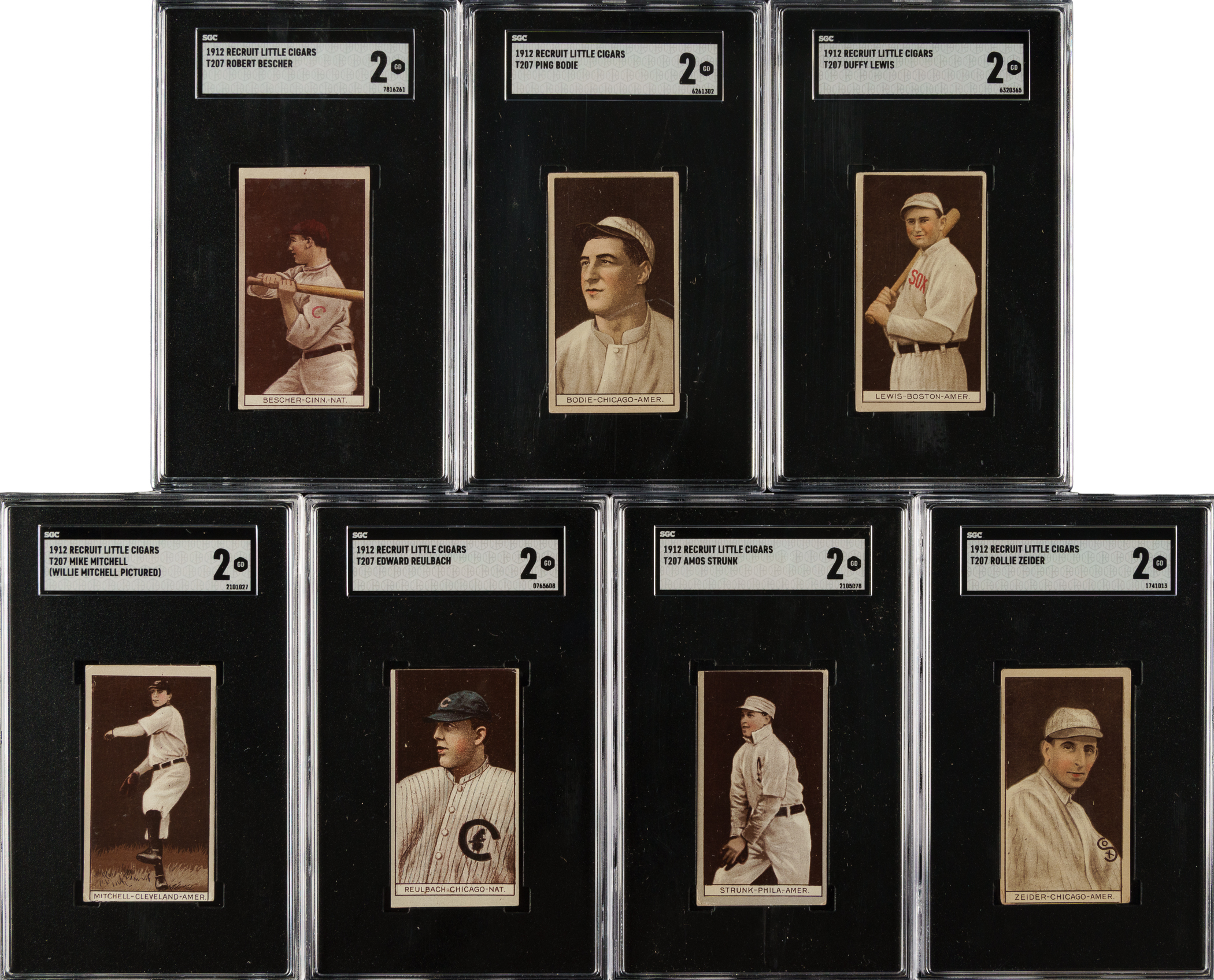Collection of seven 1912 T207 Brown Background cards, each graded and encapsulated GOOD 2 by SGC. This collection consists of the following: Bescher, Bodie, Lewis, Mitchell, Reulbach, Strunk, and Zeider. Total: 7 cards.