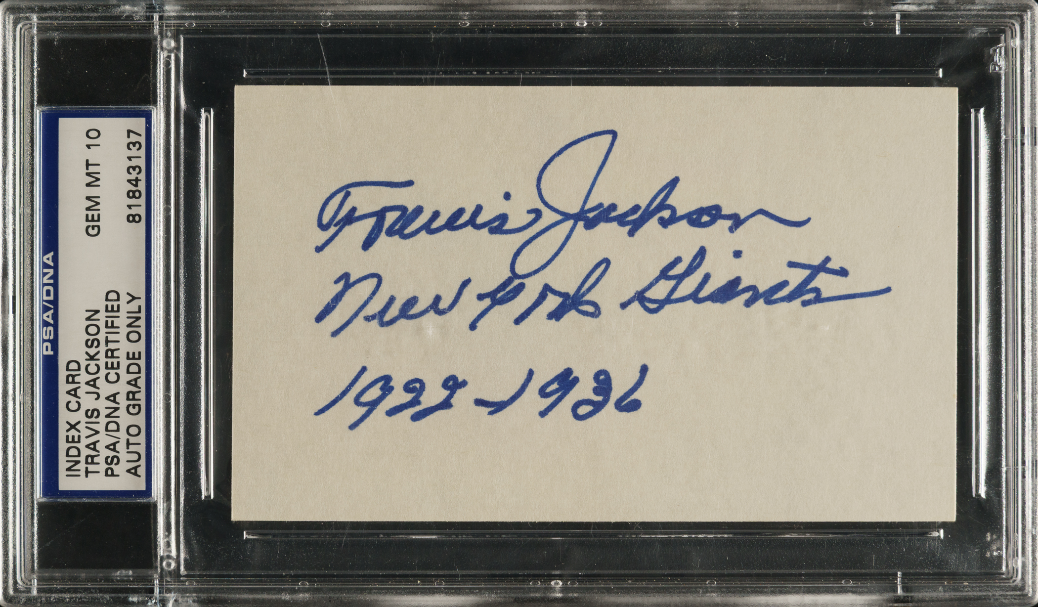 PSA/DNA has encapsulated the card and graded the signature GEM MINT 10. New York Giants Hall of Famer Travis Jackson.