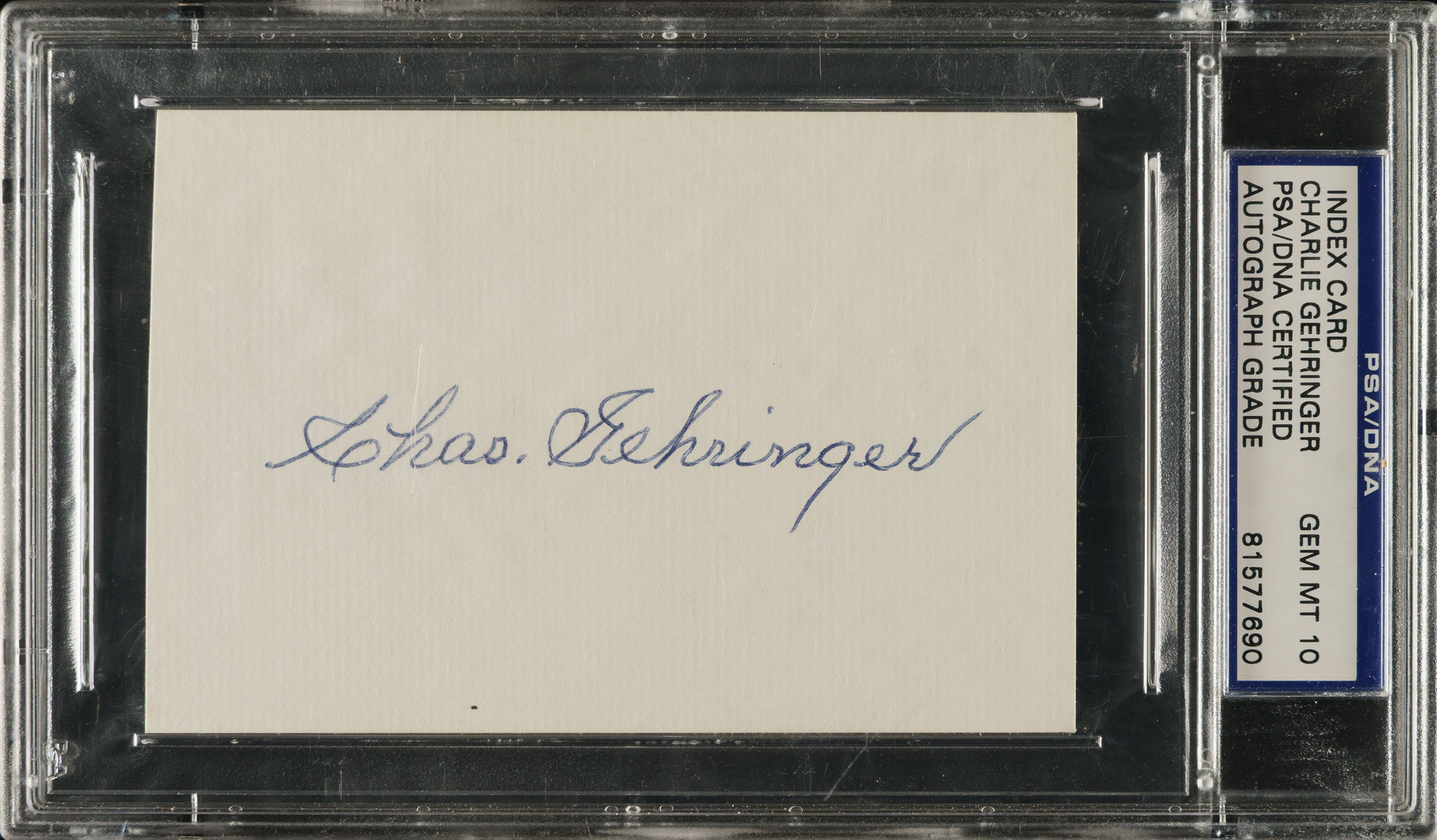PSA/DNA has encapsulated the card and graded the signature GEM MINT 10. Detroit Tigers Hall of Famer Charlie Gehringer.