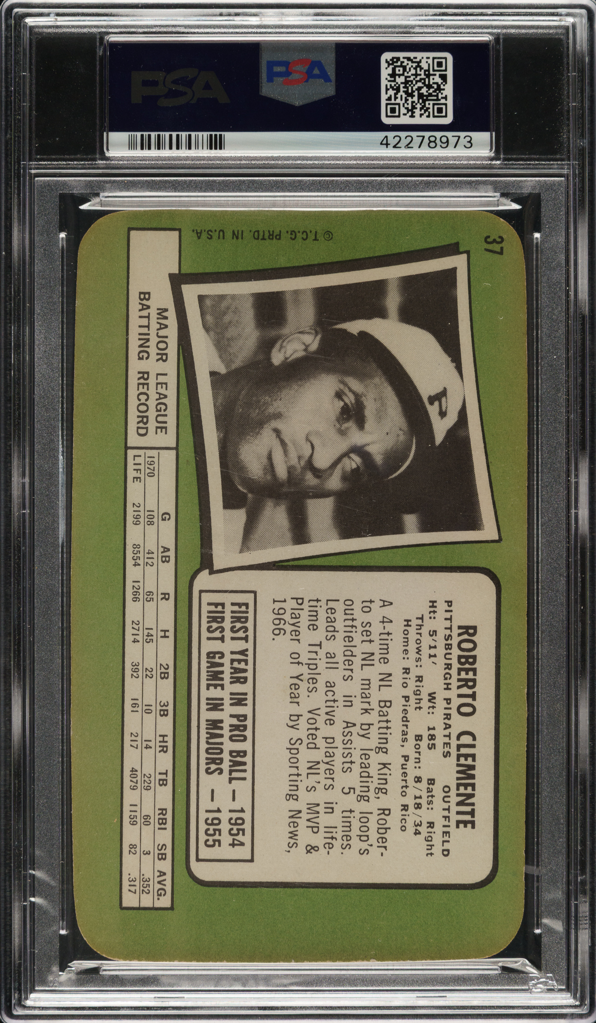 Graded NM 7 by PSA. Pittsburgh Pirates Hall of Famer Roberto Clemente.
