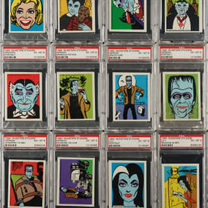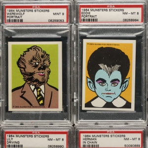 High-grade complete sticker set of 1964 Leaf "The Munsters," based on the popular TV show. Herman, Lily, Grandpa, Eddie, and, of course, the perfectly normal and beautiful Marilyn (who in this unusual family of monsters was an outcast) all lived at 1313 Mockingbird Lane. The Munsters were a sensation in 1964, and it was only natural that Leaf would honor the popular show with its own trading-card and sticker sets. One sticker was inserted in each pack. The entire set of sixteen stickers has been graded and encapsulated by PSA. PSA Grading Composite: MINT 9 (1 card): Werewolf. NM-MT 8 (5 cards): Eddie/portrait, Herman/in chain, Herman/strapped to bed, Lily/driving, and Marilyn. NM 7 (1 card): Grandpa/in chair. EX-MT 6 (9 cards): Eddie/spider web behind, Grandpa/drinking, Grandpa/portrait, Herman/drinking potion, Herman/graveyard, Herman/portrait, Herman/working on car, Lily/portrait, and Lily/reading in bed. This is an extremely attractive complete set of this very popular 1960s nonsport issue. Total: 16 stickers. The size/weight of this item requires that there will be an additional shipping charge for this lot.