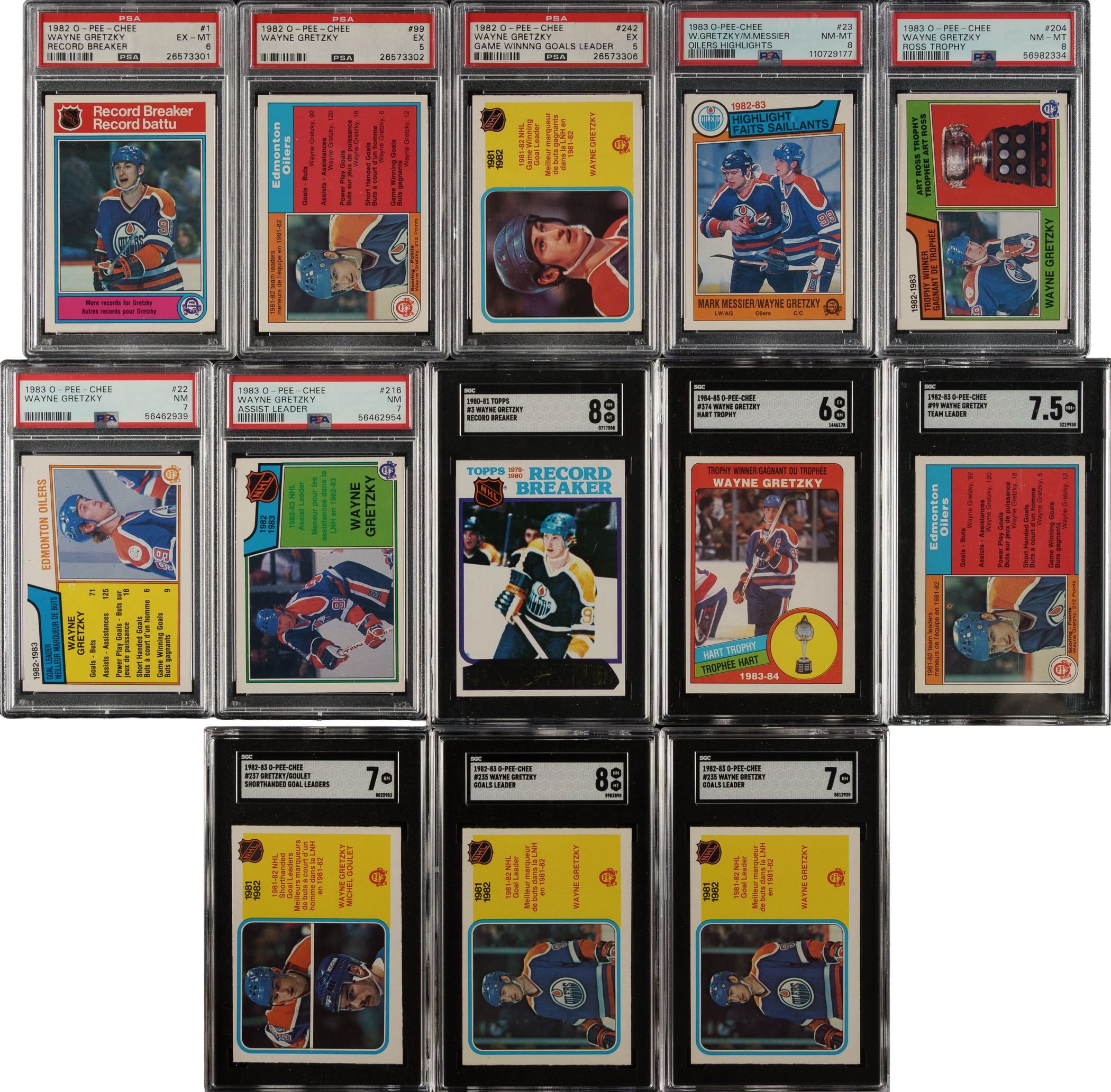 Collection of seventeen 1982-1983 to 1985-1986 Topps and O-Pee-Chee Hockey Wayne Gretzky cards, each professionally graded and encapsulated by PSA (9) and SGC (8). This collection consists of the following: 1) 1980-1981 Topps (2 cards): #3 Gretzky RB (SGC NM/MT 8) and 182 Gretzky (SGC NM 7). 2) 1982-1983 O-Pee-Chee (8 cards): #1 Gretzky RB (EX-MT 6), two 99 Gretzky Team Scoring Ldr (SGC NM+ 7.5 and PSA EX 5), 107 Gretzky IA (NM 7), two 235 Gretzky Goals Ldr (SGC NM/MT 8 and SGC NM 7), 237 Gretzky Shorthanded Goals Ldr (SGC NM 7), and 242 Gretzky Game Winning Goals Ldr (EX 5). 3) 1983-1984 O-Pee-Chee (4 cards): #22 Gretzky Goal Ldr (NM 7), 23 Gretzky/Messier (NM-MT 8), 204 Gretzky Ross Trophy (NM-MT 8), and 216 Gretzky Assist Ldr (NM 7). 4) 1984-1985 O-Pee-Chee (2 cards): #208 Gretzky AS (MINT 9) and 374 Gretzky Hart Trophy (SGC EX/NM 6). 5) 1985-1986 Topps (1 card): #120 Gretzky (SGC NM 7). Total: 17 cards. The size/weight of this item requires that there will be an additional shipping charge for this lot.