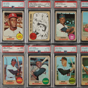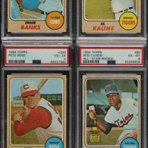 Collection of fourteen 1968 Topps baseball cards, each professionally graded and encapsulated by PSA. This collection includes seven Hall of Famers and is highlighted by Rod Carew, Pete Rose, and Ernie Banks. This collection consists of the following: PSA Grading Composite: NM-MT 8 (1 card): #263. NM 7 (2 cards): #167 Howard and 240 Kaline. EX-MT 6 (6 cards): #80 Carew, 152 Yaz Smashes Two Homers, 250 Yastrzemski, 290 McCovey, 381 Powell, and 546. EX 5 (1 card): #520 Brock. VG-EX 4 (4 cards): #100 Gibson, 180, 230 Rose, and 355 Banks. Total: 14 cards. The size/weight of this item requires that there will be an additional shipping charge for this lot.