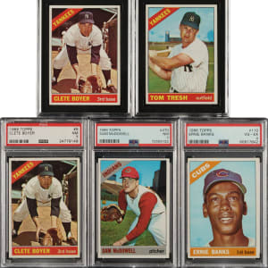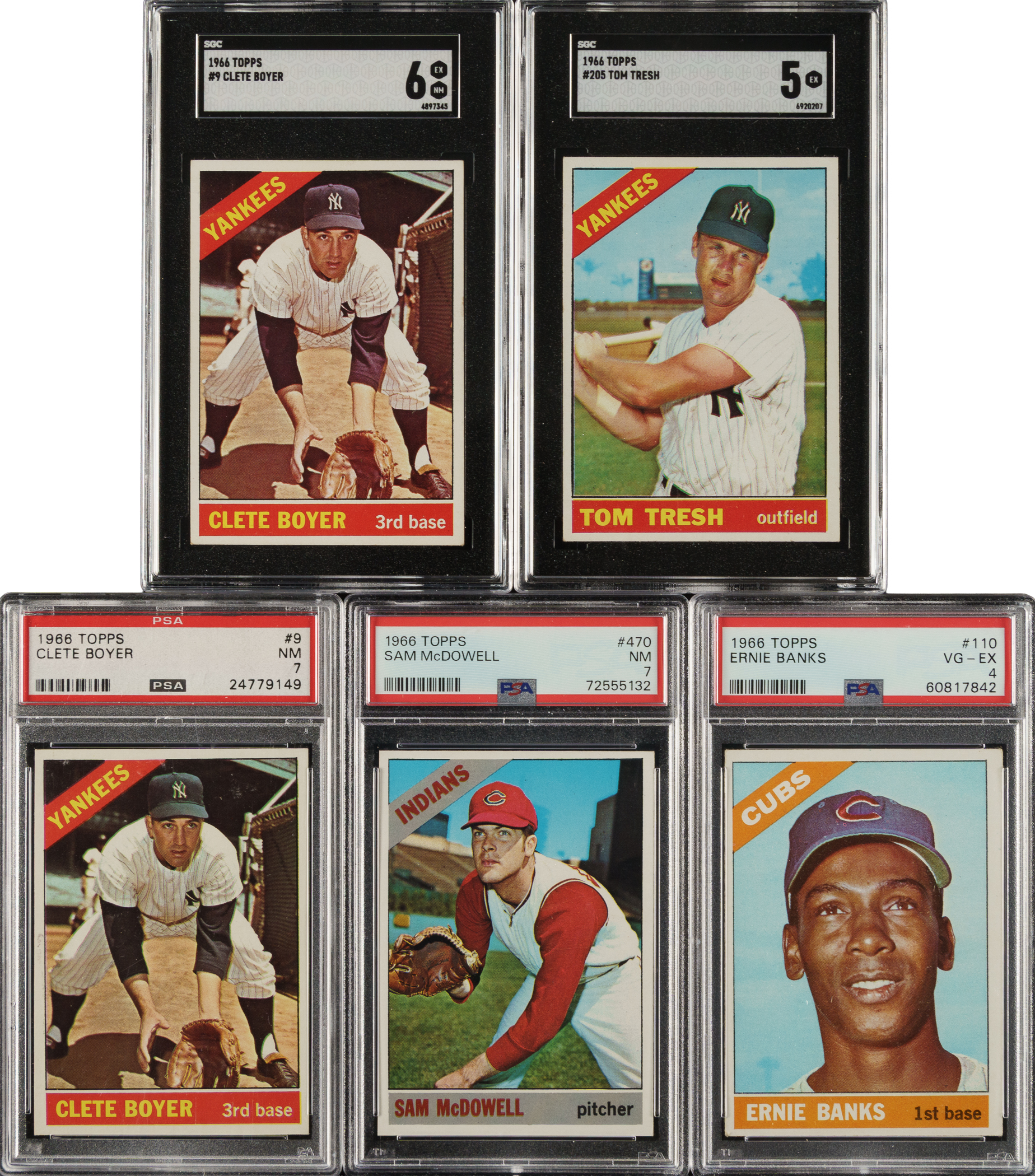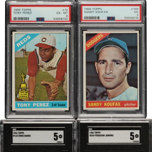 Collection of nine 1966 Topps baseball cards, each professionally graded and encapsulated by PSA () and SGC (). This collection includes five Hall of Famers and is highlighted by Sandy Koufax, two Ernie Banks, and Fergie Jenkins (rookie). This collection consists of the following: PSA Grading Composite: NM 7 (2 cards): #9 and 470. EX-MT 6 (2 cards): #9 (SGC) and 72 Perez. EX 5 (3 cards): #110 Banks (SGC), 205 (SGC), and 254 Jenkins RC (SGC). VG-EX 4 (1 card): #110 Banks. VG 3 (1 card): #100 Koufax. Total: 9 cards. The size/weight of this item requires that there will be an additional shipping charge for this lot.