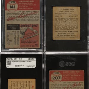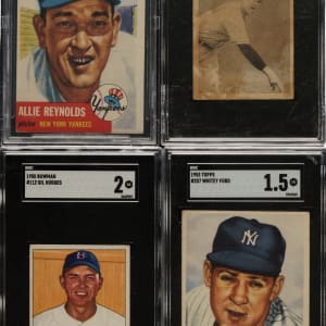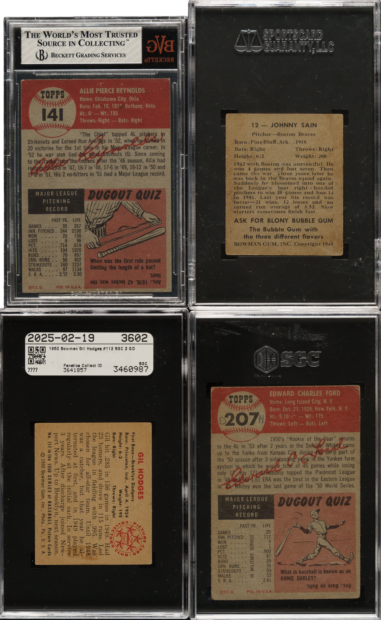 Collection of four 1948 to 1953 Topps and Bowman Hall of Famers and stars, each professionally graded and encapsulated by SGC (3) and BVG (1). This collection consists of the following: 1) 1948 Bowman (1 card): #12 Sain RC (FAIR 20). 2) 1950 Bowman (1 card): #112 Hodges (GOOD 2). 3) 1953 Topps (2 cards): #141 Reynolds (BVG VG-EX+ 4.5) and 207 Ford (FAIR 1.5). Total: 4 cards.