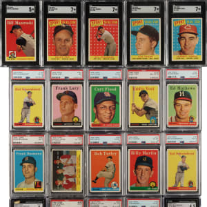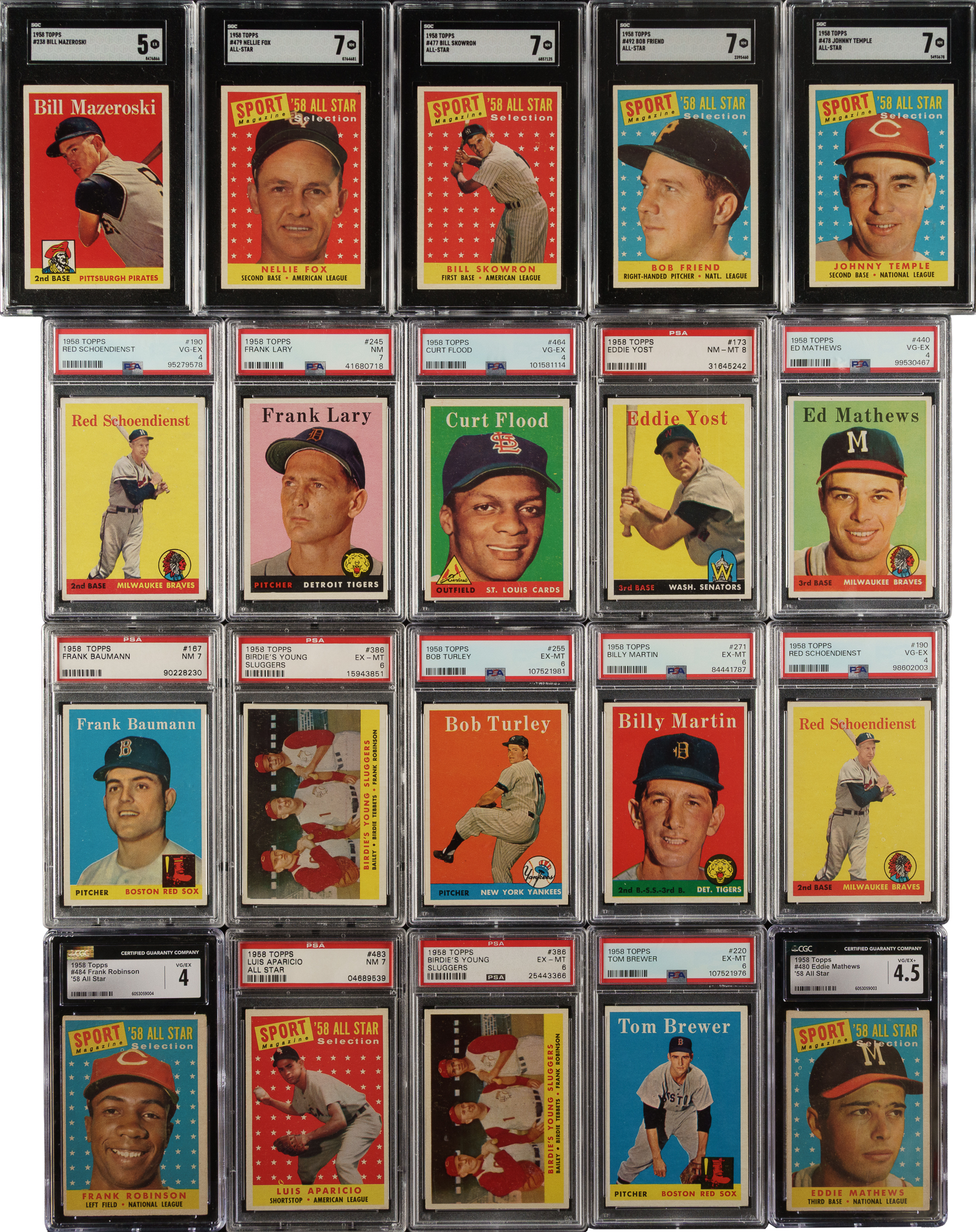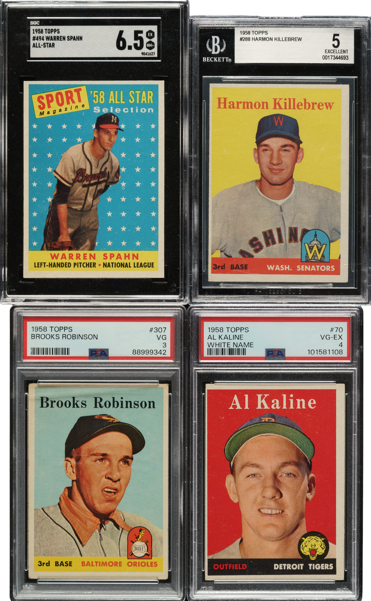 Collection of twenty-four 1958 Topps baseball cards, each professionally graded and encapsulated by PSA (15), SGC (6), Beckett (1), and CGC (2). This collection includes twelve Hall of Famers and is highlighted by Brooks Robinson, Al Kaline, and Warren Spahn. This collection consists of the following: PSA Grading Composite: NM-MT 8 (1 card): #173. NM 7 (7 cards): #167, 245, 477 Skowron AS (SGC), 478 (SGC), 479 Fox AS (SGC), 483 Aparicio AS, and 492 (SGC). EX-MT 6 (6 cards): #220, 255, 271 Martin, two 386, and 494 Sphan AS (SGC EX/NM+ 6.5). EX 5 (2 cards): #238 Mazeroski (SGC) and 288 Killebrew (Beckett). VG-EX+ 4.5 (1 card): #480 Mathews AS (CGC). VG-EX 4 (6 cards): #70b Kaline/white name, two 190 Schoendienst, 440 Mathews, 464 Flood RC, and 484 F. Robinson AS (CGC). VG 3 (1 card): #307 B. Robinson. Total: 24 cards. The size/weight of this item requires that there will be an additional shipping charge for this lot.