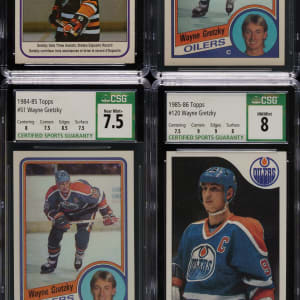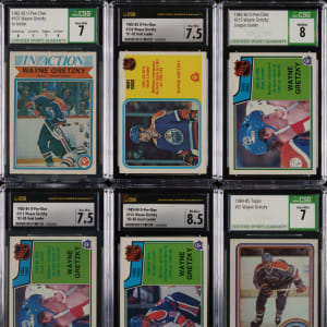 Collection of ten 1981-1982 to 1985-1986 Topps and O-Pee-Chee Wayne Gretzky hockey cards, each professionally graded and encapsulated by CSG (one by CGC). This collection consists of the following: 1) 1981-1982 O-Pee-Chee (1 card): #392 Gretzky RB (EX/NM+ 6.5). 2) 1982-1983 O-Pee-Chee (2 cards): #107 Gretzky IA (NM 7) and 235 Gretzky Goal Ldr (NM+ 7.5). 3) 1983-1984 O-Pee-Chee (3 cards): Two #215 Gretzky Goal Ldr (NM/MT 8 and NM+ 7.5) and 216 Gretzky Assist Ldr (NM/MT+ 8.5). 4) 1984-1985 Topps (2 cards): Two #51 Gretzky (NM+ 7.5 and NM 7). 5) 1984-1985 O-Pee-Chee (1 card): #243 Gretzky (CGC NM+ 7.5). 6) 1985-1986 Topps (1 card): #120 Gretzky (NM/MT 8). Total: 10 cards. The size/weight of this item requires that there will be an additional shipping charge for this lot.