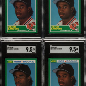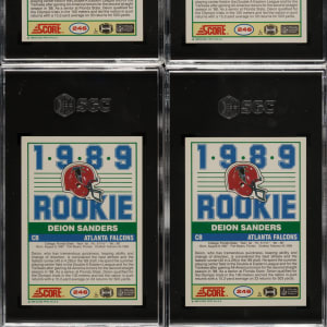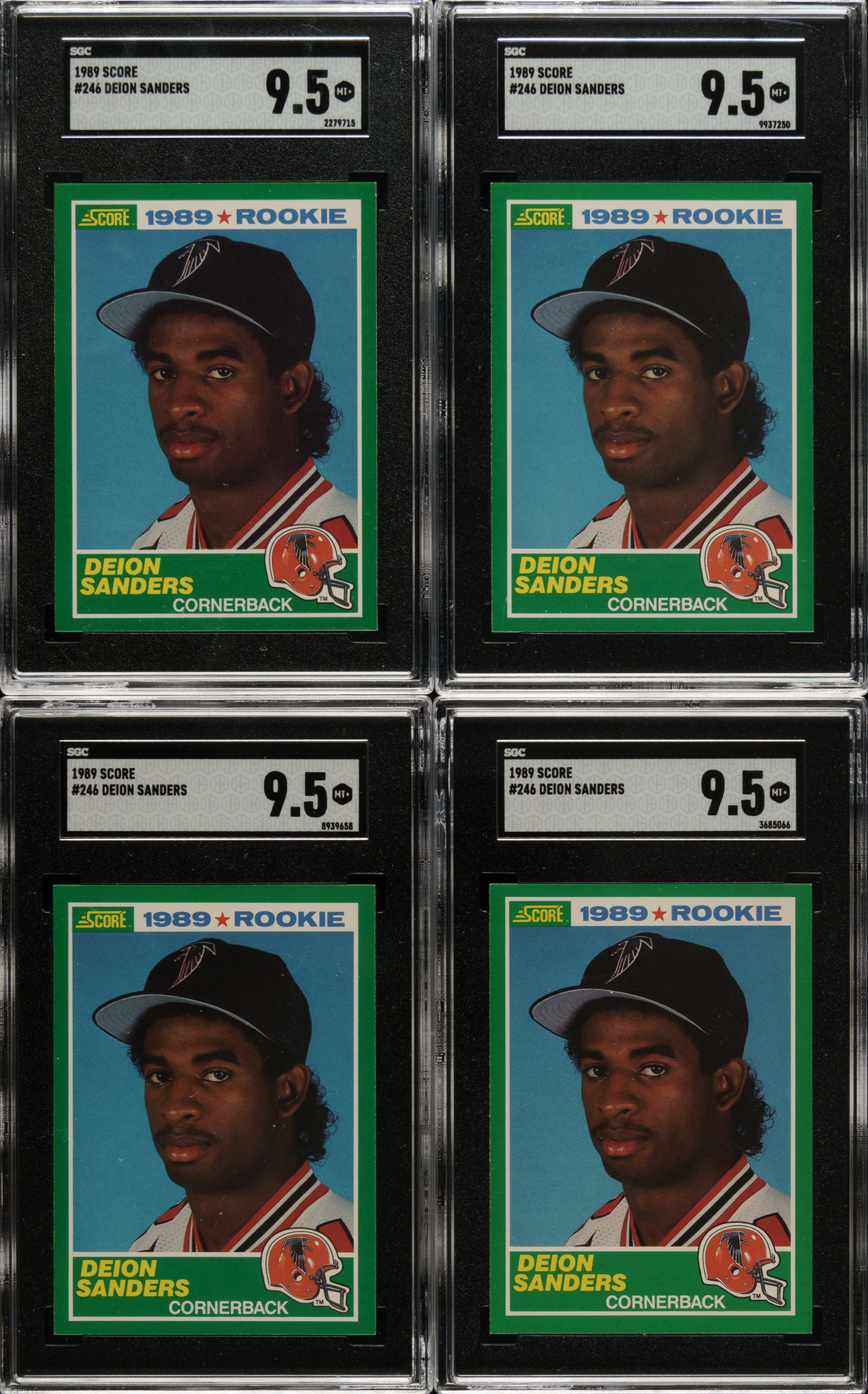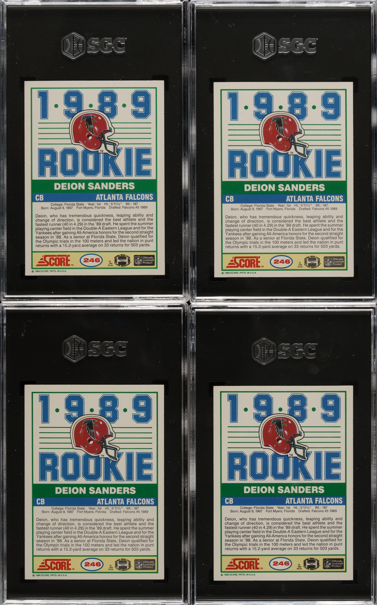 Collection of four 1989 Score Football #246 Deion Sanders rookie cards, each professionally graded MINT+ 9.5 and encapsulated by SGC. Total: 4 cards.