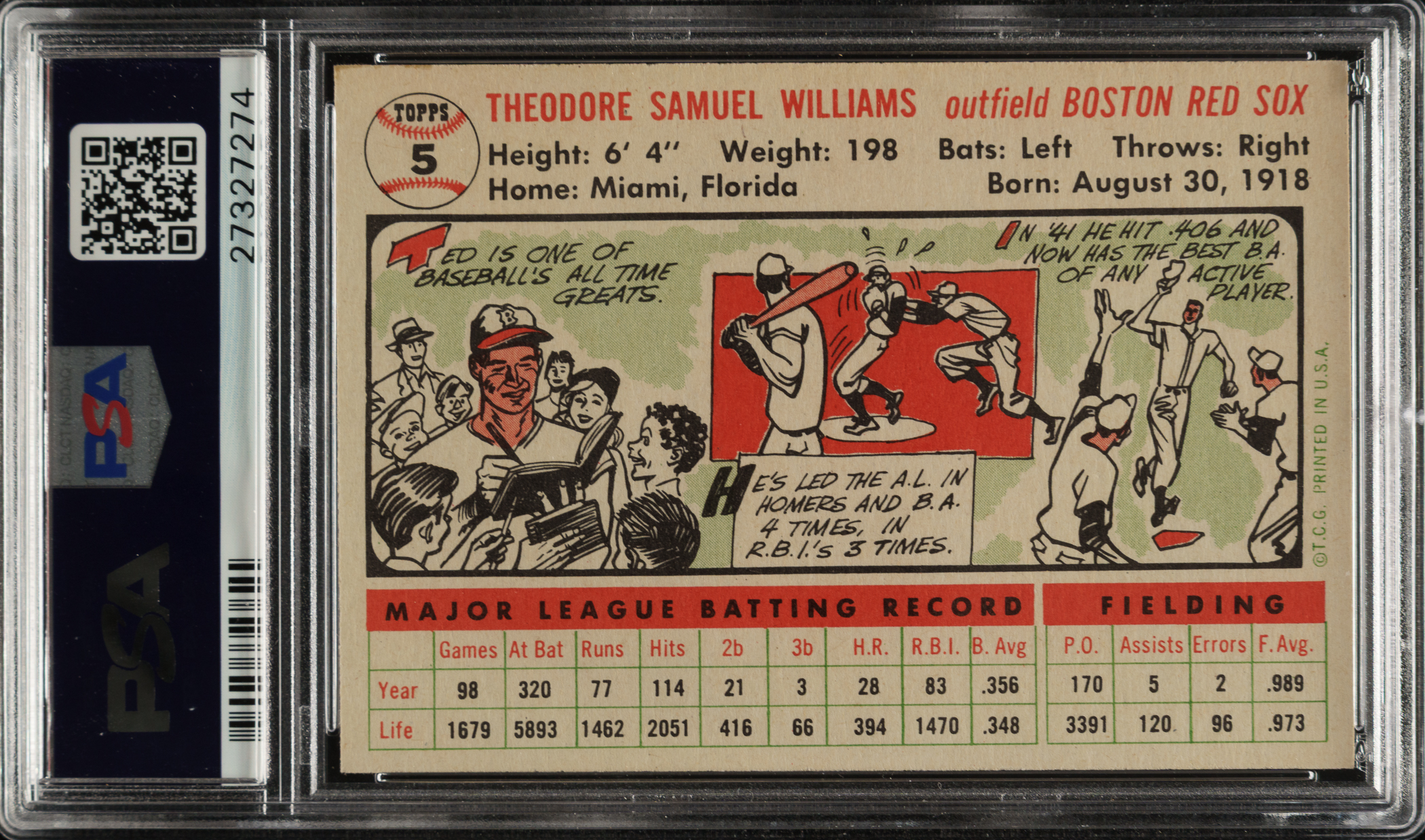 Graded MINT 9 by PSA. Only one example grades higher out of more than 7,500 cards (gray and white backs) evaluated by PSA to date. Magnificent high-grade example of one of Boston Red Sox Hall of Famer Ted Williams' most popular cards.. The card boasts beautiful colors, excellent registration, sharp corners, and excellent centering. The white back is clean and boldly printed. Though Williams broke into the majors all the way back in 1939, when this card was issued during his seventeenth Major League season, he was still in top form. Williams hit .345 in 1956, and the statistics on the reverse of the card show Williams hitting .356 the previous season. An exceptionally attractive example worthy of any world-class 1956 Topps set.