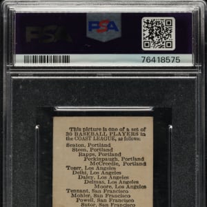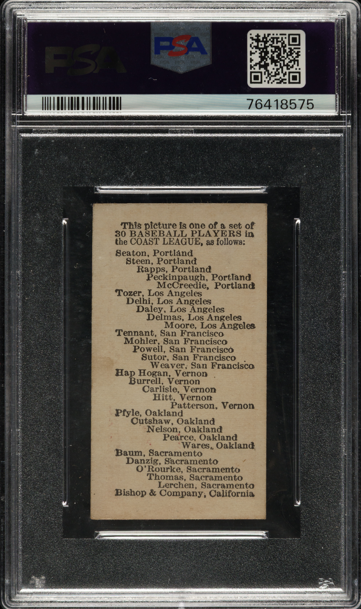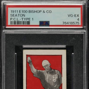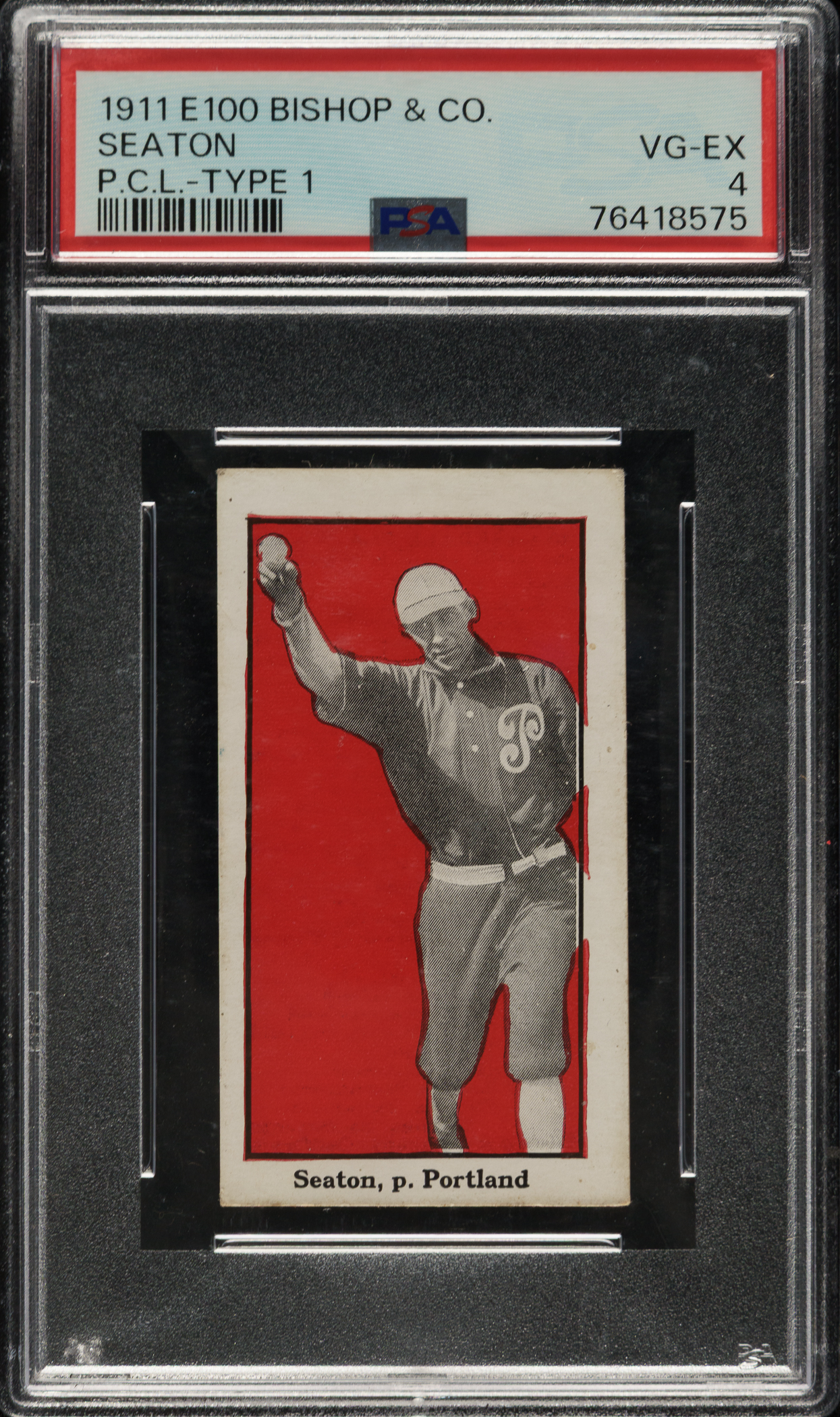 Graded VG-EX 4 by PSA. Portland Beavers. Offered is a striking mid-grade example of Tom Seaton from the 1911 E100 Bishop & Co. PCL Type I series. E100 Bishops are among the rarest of all "E card" issues, and one of the most highly prized of all PCL issues. Distributed by Bishop & Company of Los Angeles, E100s are noted for their brightly colored backgrounds (red, blue, yellow, purple, or green) and extreme rarity.