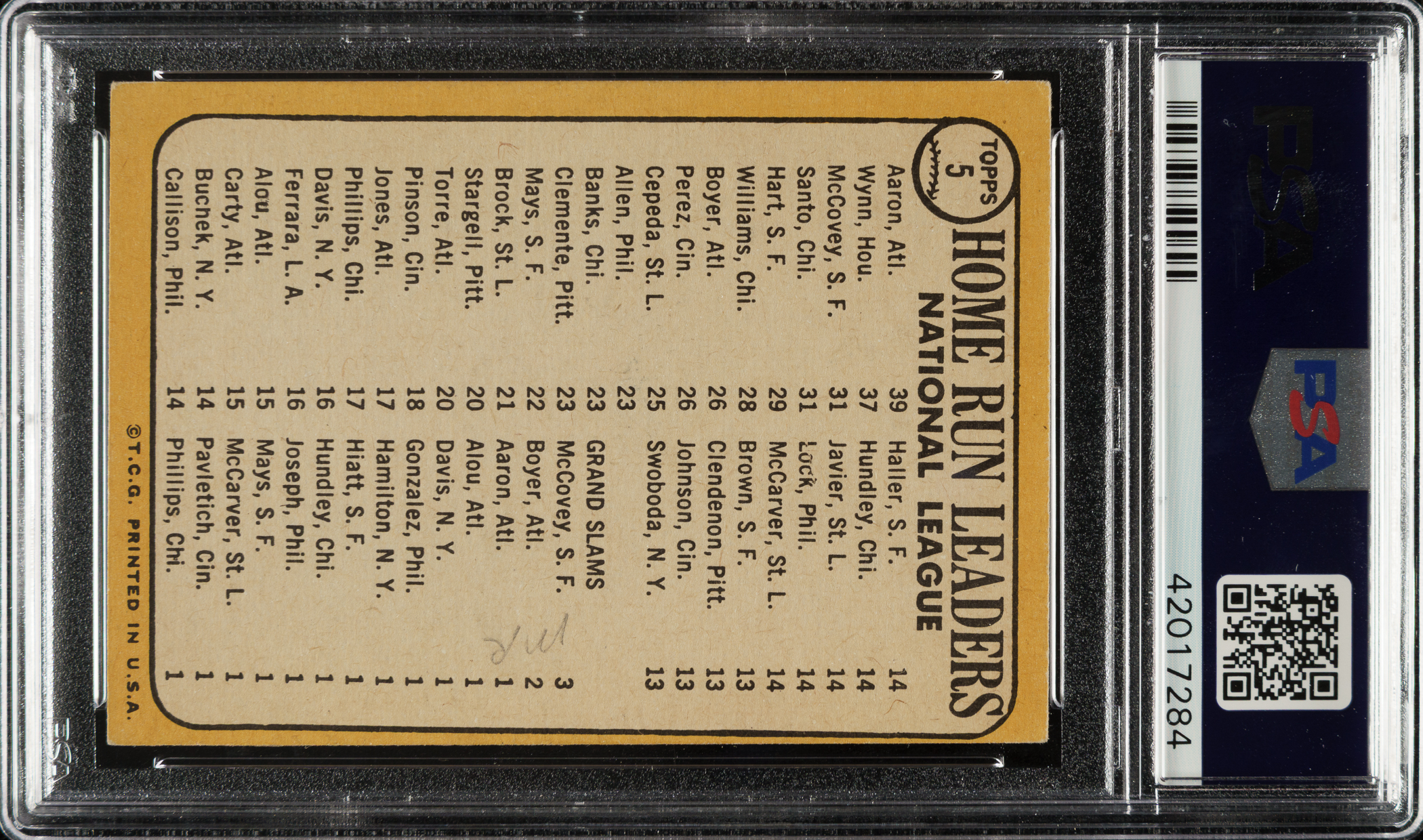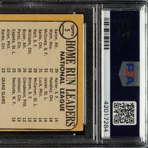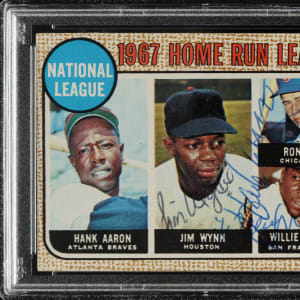 PSA/DNA has encapsulated the card, grading the signatures MINT 9 and the card EX 5 (MK). Atlanta Braves, Chicago Cubs, and San Francisco Giants Hall of Famers Hank Aaron, Ron Santo, and Willie McCovey.