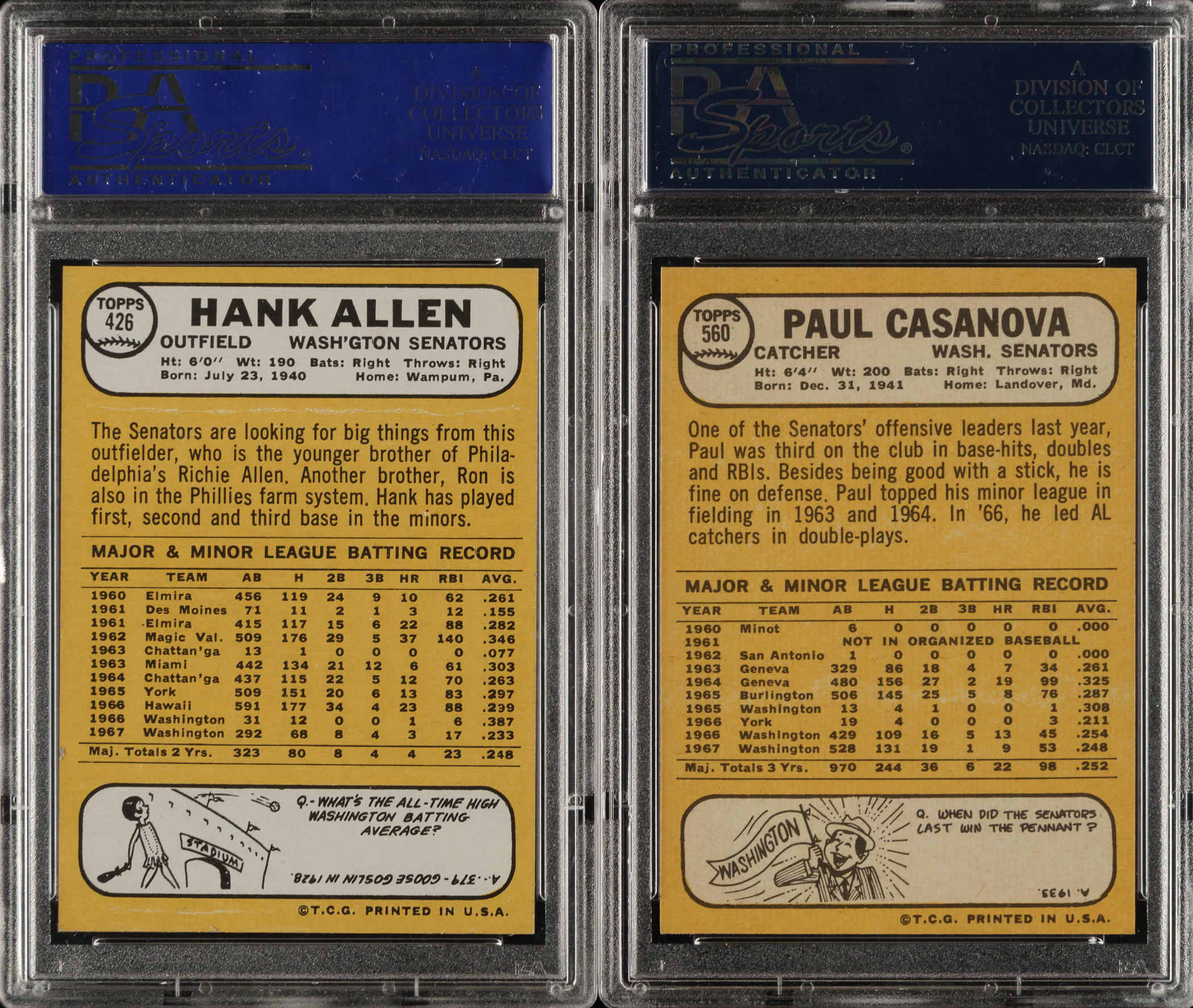 Pair of 1968 Topps cards, both graded and encapsulated MINT 9 by PSA. This pair consists of the following: #426 and 560. Total: 2 cards.
