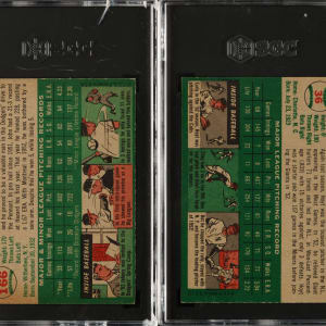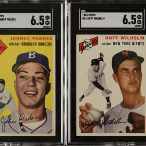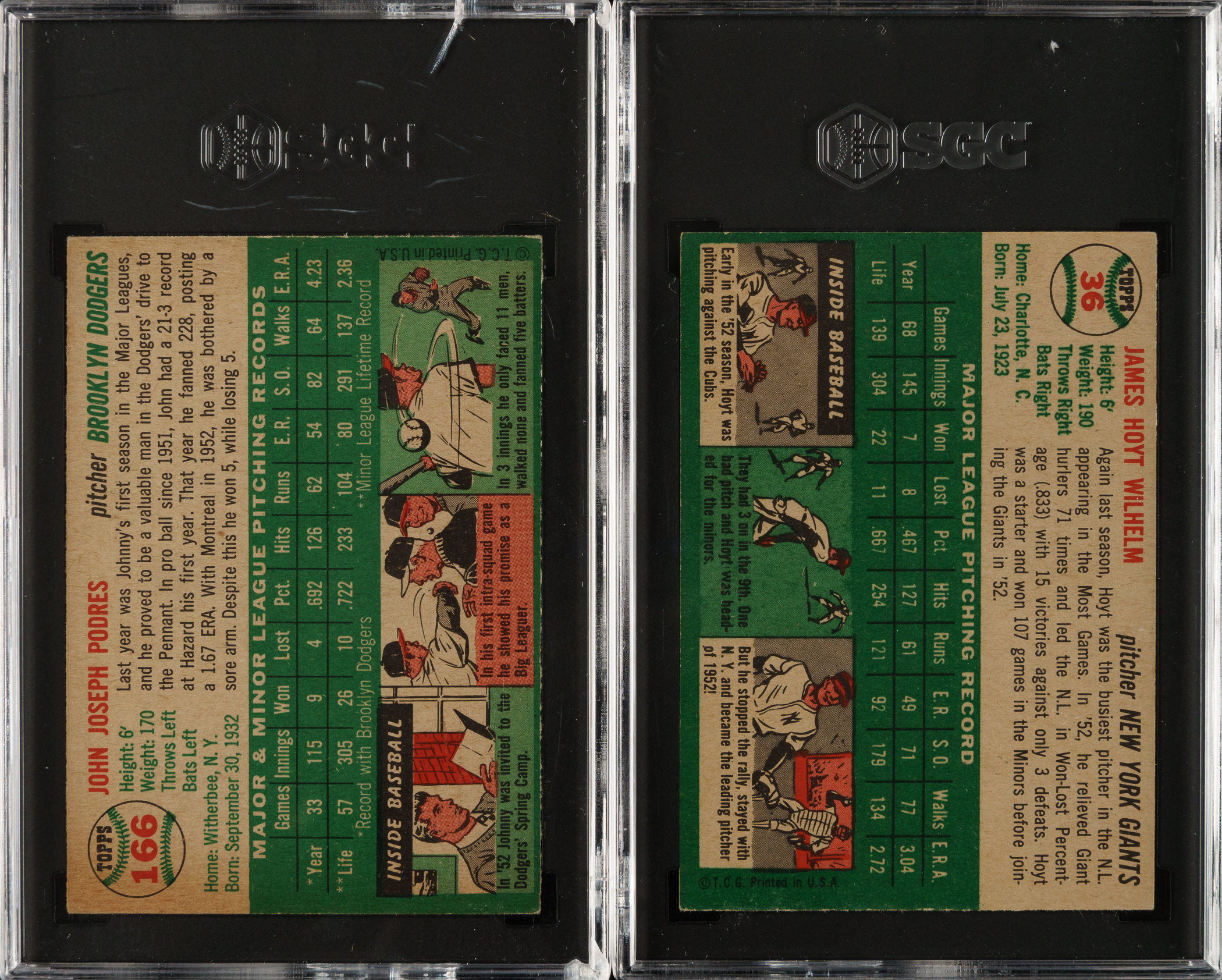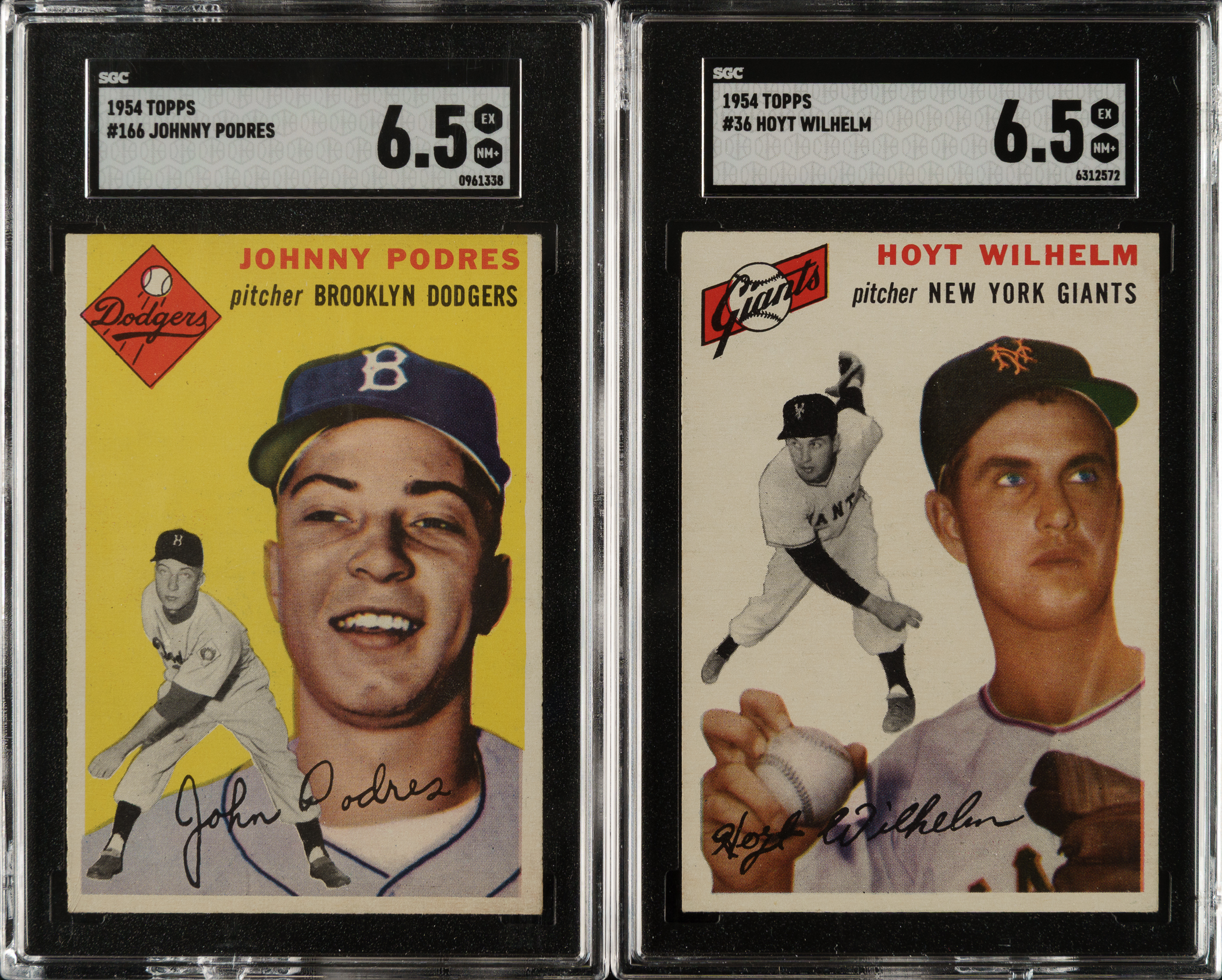 Pair of 1954 Topps cards, featuring New York Giants Hall of Famer Hoyt Wilhelm. Both cards have been graded and encapsulated EX/NM+ 6.5 by SGC. This pair consists of the following: #36 Wilhelm and 166. Total: 2 cards.