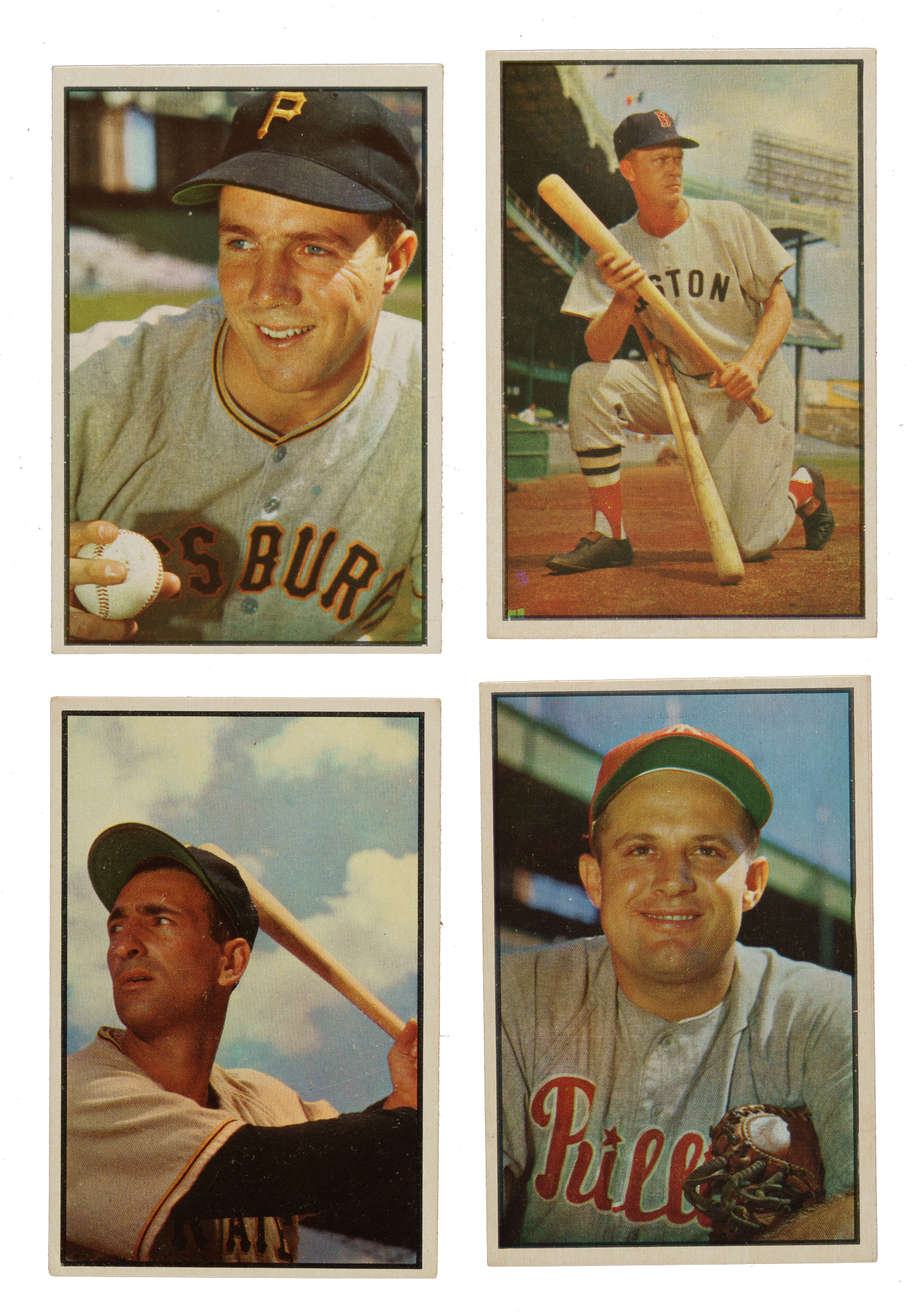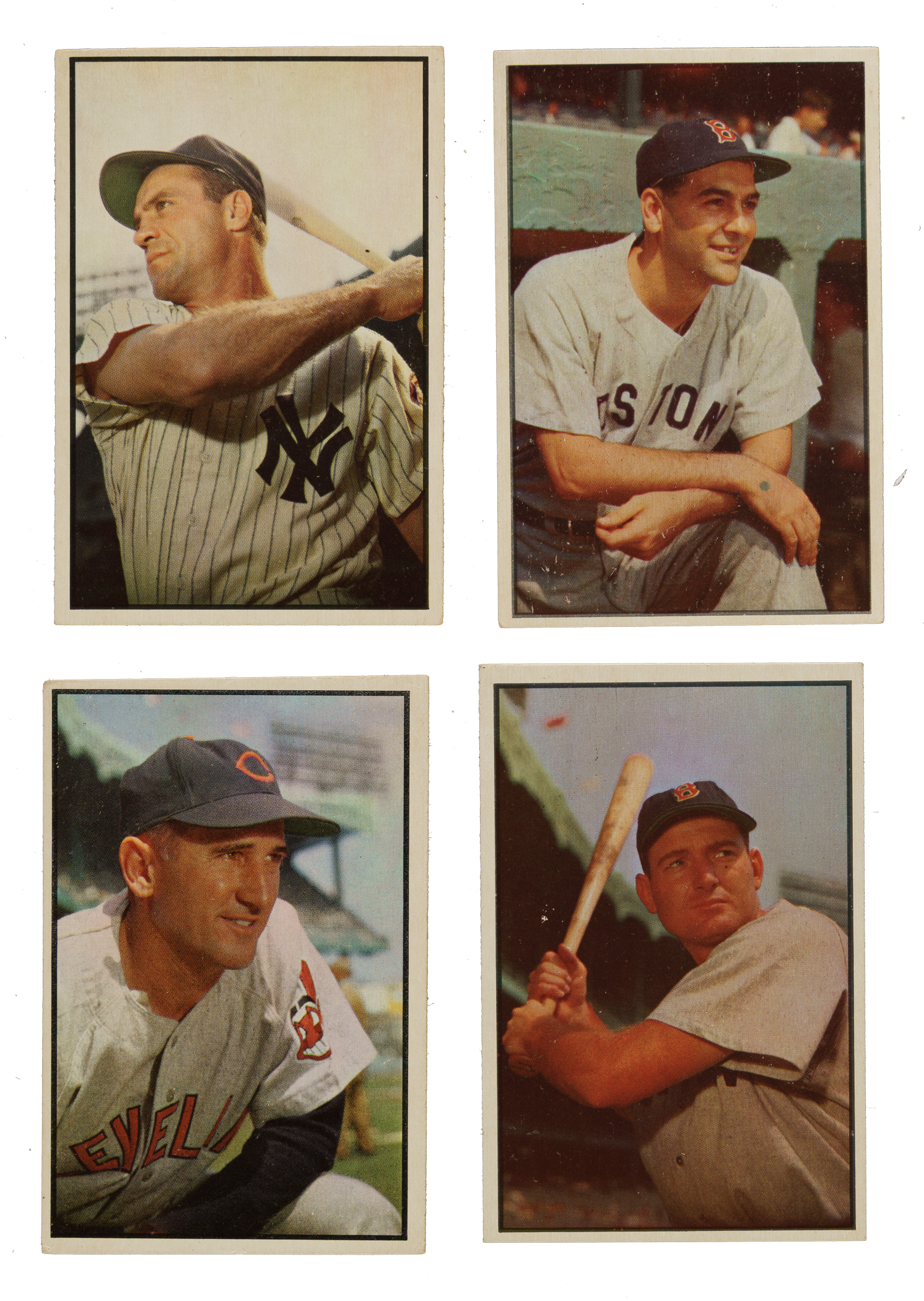 Collection of forty-one 1953 Bowman Color cards, featuring Boston Red Sox and Cleveland Indians Hall of Famers Lou Boudreau, George Kell and Al Lopez. Condition is 41% Ex to Ex-Mt and 59% Vg to Vg-Ex (including one lesser). This collection consists of the following: #2, 4, 13, 14, 16, 17, 19-30, 34, 35, 37, 38, 41, 42, 45, 57 Boudreau (Vg), 58, 61 Kell (Ex+), 64, 66, 68, 77, 78, 79, 84 Bauer (Vg+), 96, 134, 139, 143 Lopez (Vg), 148, and 160. Total: 41 cards.