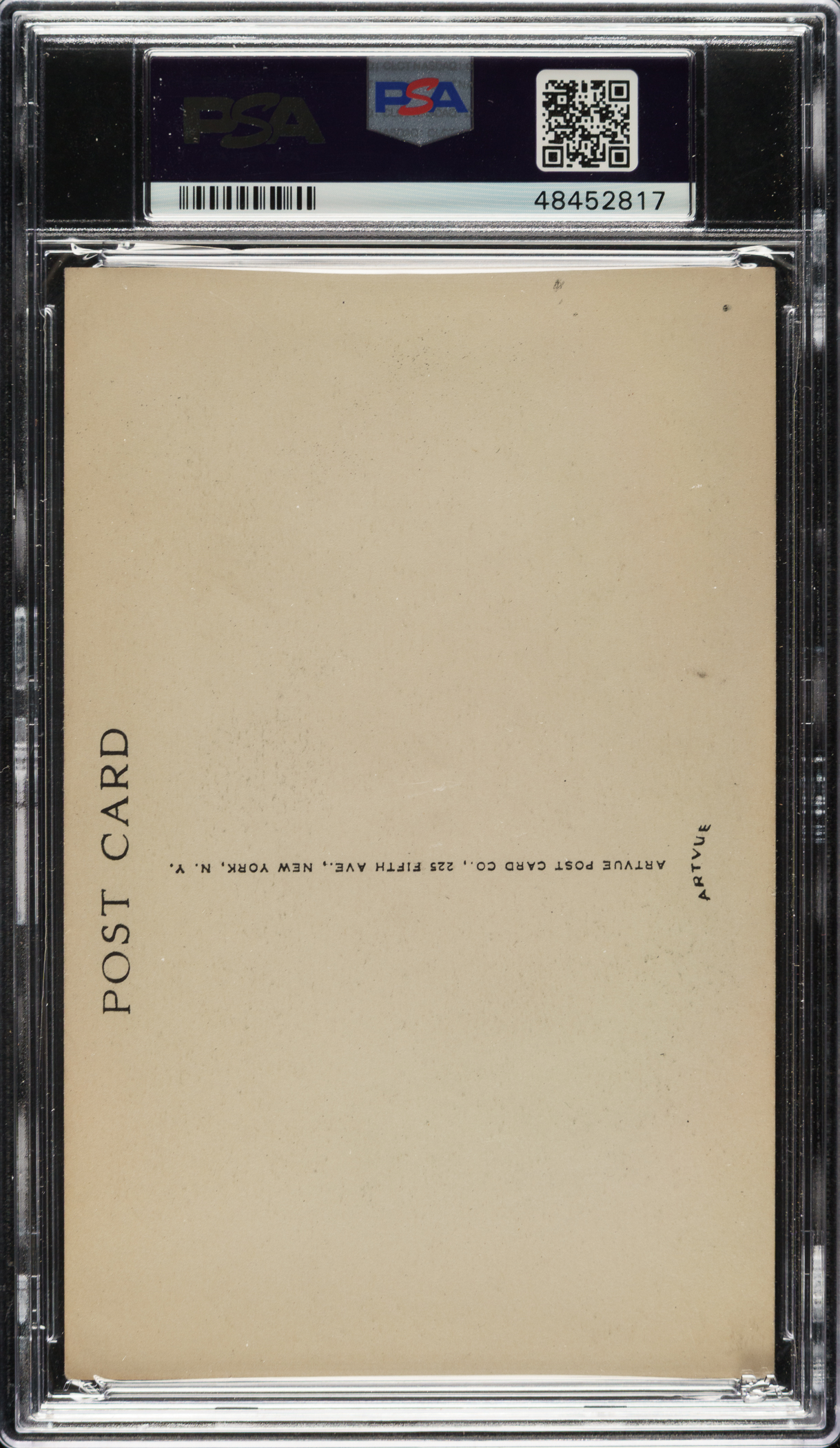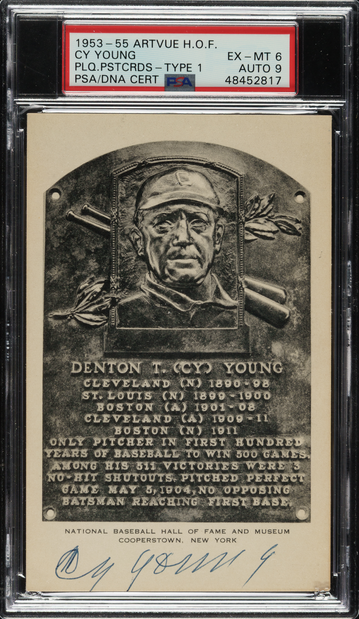 Black-and-white Hall of Fame plaque postcard (Artvue, Type 1) of pitcher Cy Young signed by him in blue ink along the base. PSA/DNA has encapsulated the card, grading the card EX-MT 6 and the signature MINT 9. Cy Young is one of the most desirable of all signed black-and-white Hall of Fame postcards. Black-and-white Hall of Fame postcards were issued only between the years 1944 and 1963. Young was elected to the Hall of Fame in 1937, and he died in 1955. The postcard (3.5 x 5.5 inches), which is not addressed or mailed, has light corner wear. This is a desirable example featuring a strong signature, making it an ideal addition to any Cy Young or Hall of Fame collection.