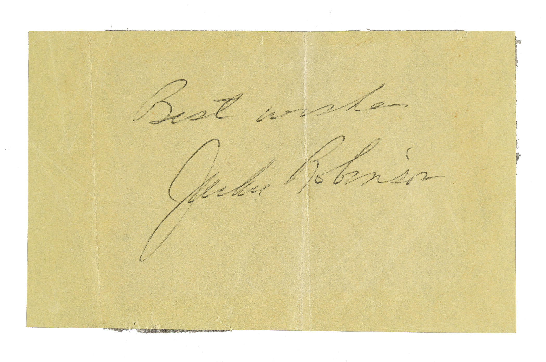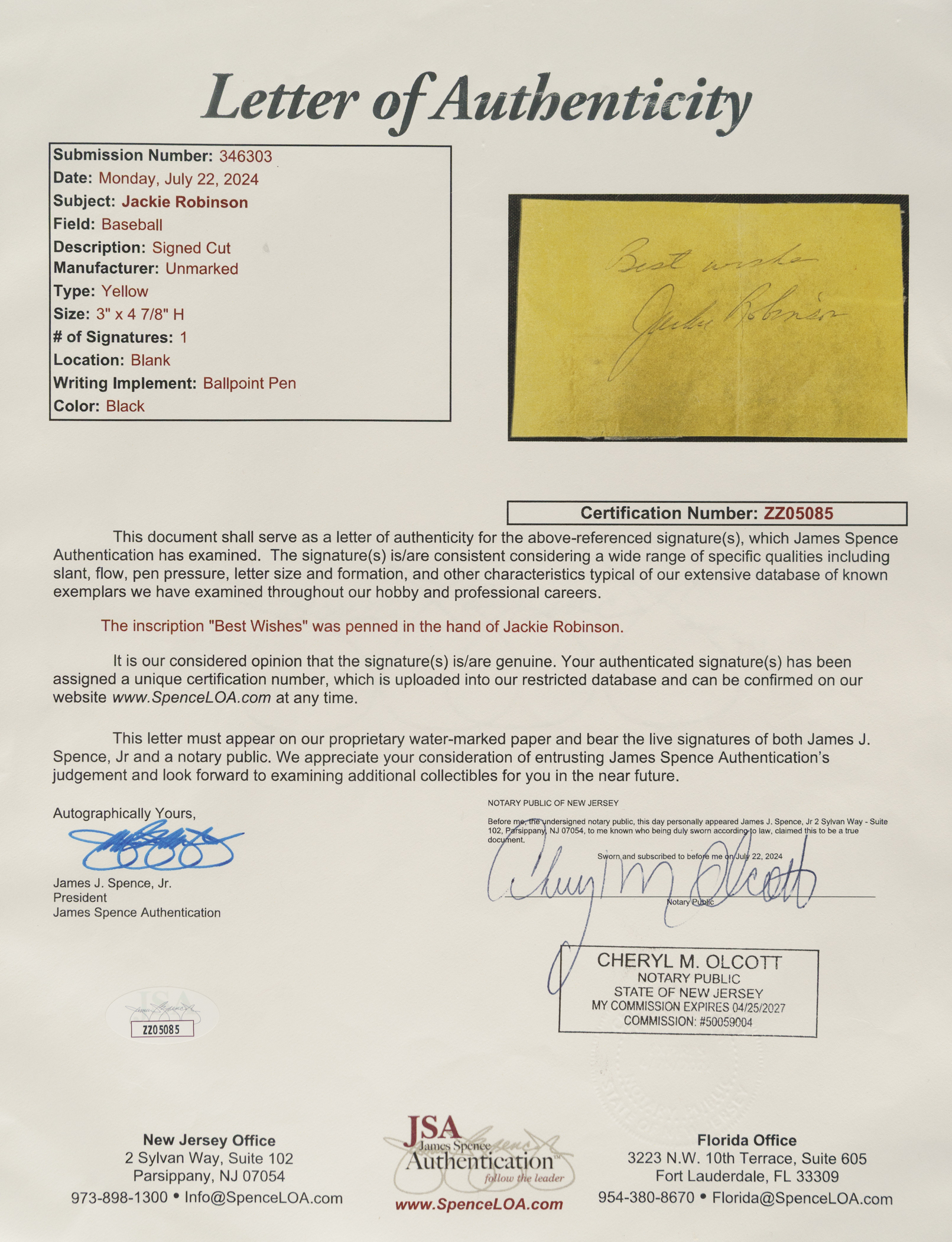 Cut signature of Brooklyn Dodgers Hall of Famer Jackie Robinson. Signed "Best Wishes/Jackie Robinson" in black ink. The sheet (4.75 x 3 inches) displays two vertical fold lines (small tear on one fold line), a number of creases, and a piece of clear tape on the reverse. In Fair condition overall. Full LOA from James Spence/JSA.