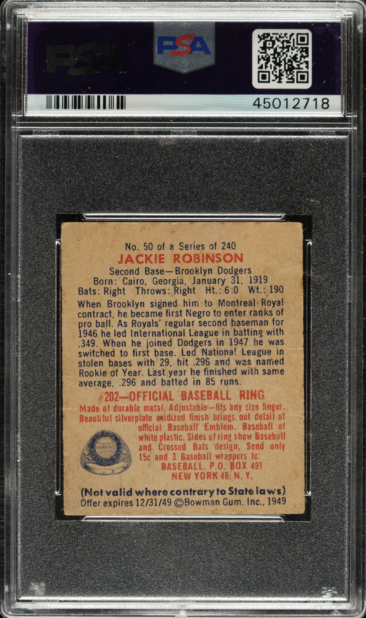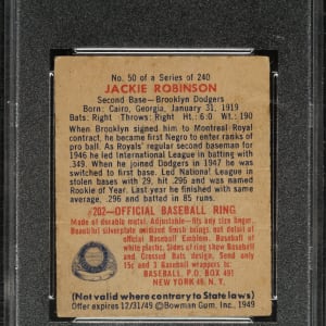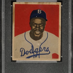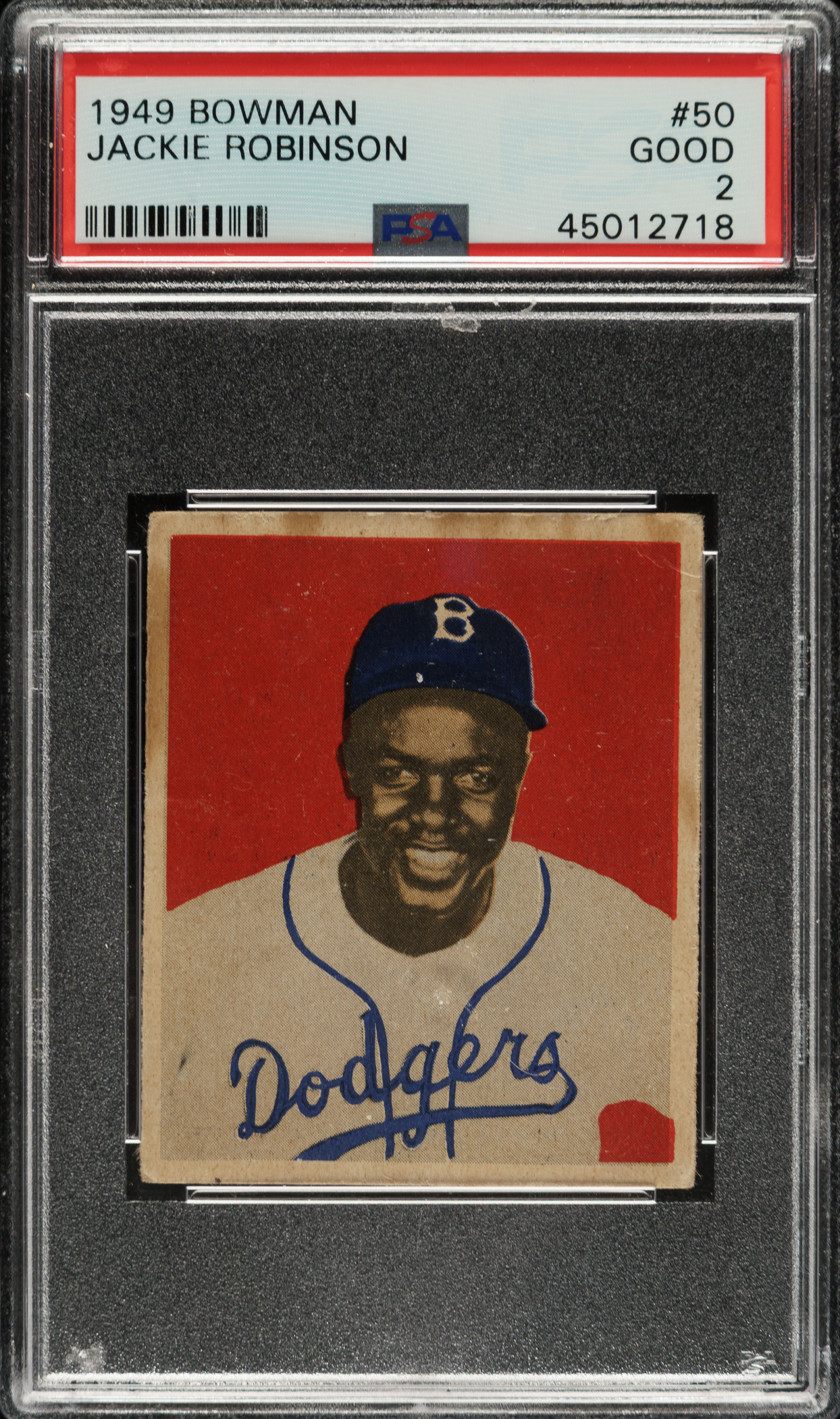 Graded GOOD 2 by PSA. Very presentable 1949 Bowman example of Brooklyn Dodgers Hall of Famer Jackie Robinson. This is one of Robinson’s most striking and popular cards and one of the great classics of all postwar bubble-gum cards. The offered card has bold colors, outstanding registration, and even corner wear. Downgraded largely to several light creases and minor staining on the borders.