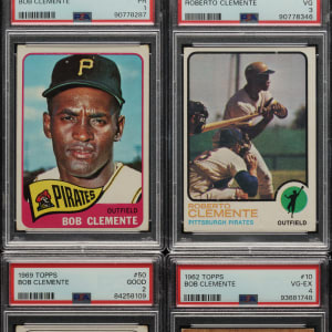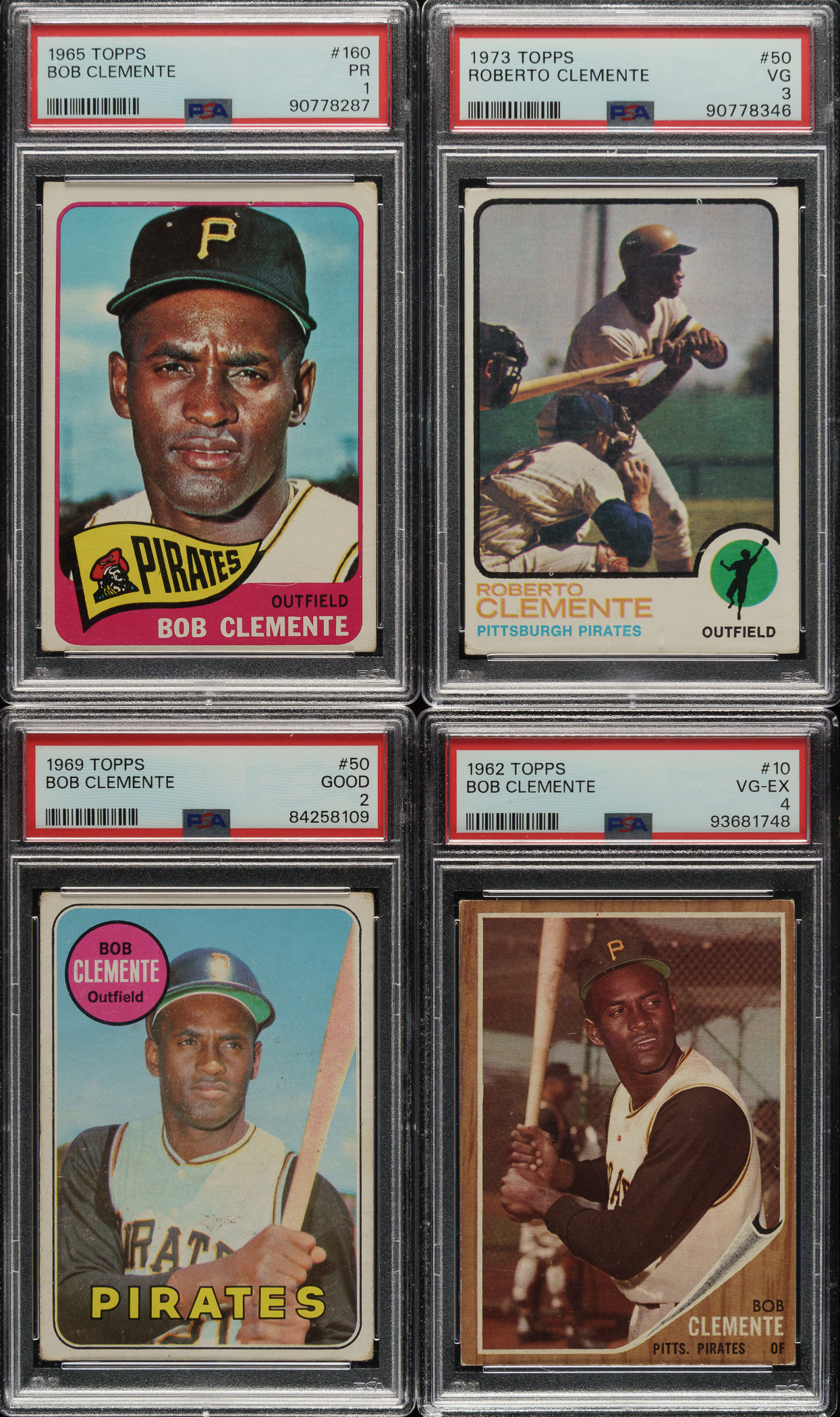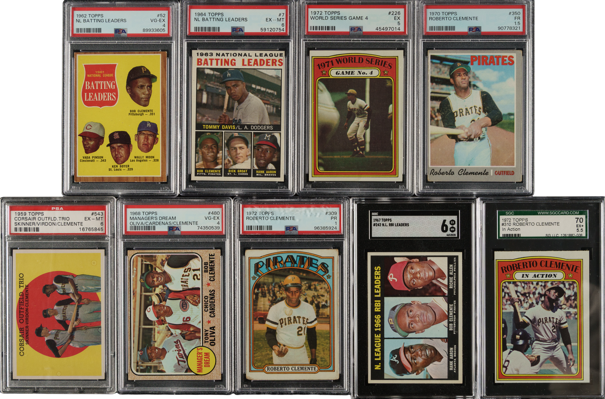 Collection of thirteen 1959 to 1973 Topps Roberto Clemente baseball cards, each professionally graded and encapsulated by PSA (11) and SGC (2). This collection consists of the following: 1) 1959 (1 card): #543 Corsair Outfield Trio w/ Clemente (EX-MT 6). 2) 1962 Topps (2 cards): #10 Clemente (VG-EX 4) and 52 NL Batting Ldrs w/ Clemente (VG-EX 4). 3) 1964 Topps (1 card): #7 NL Batting Ldrs w/ Clemente and Aaron (EX-MT 6). 4) 1965 Topps (1 card): #160 Clemente (POOR 1). 5) 1967 Topps (1 card): #242 NL RBI Ldrs w/ Clemente and Aaron (SGC EX/NM 6). 6) 1968 Topps (1 card): #480 Manager's Dream w/ Clemente (VG-EX 4). 7) 1969 Topps (1 card): #50 Clemente (GOOD 2). 8) 1970 Clemente (1 card): #350 Clemente (FAIR 1.5). 9) 1972 Topps (3 cards): #226 WS Gm 4 (EX 5), 309 Clemente (POOR 1), and 310 Clemente IA (SGC EX+ 70). 10) 1973 Topps (1 card): #50 Clemente (VG 3). Total: 13 cards. The size/weight of this item requires that there will be an additional shipping charge for this lot.