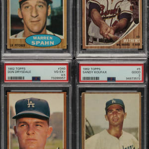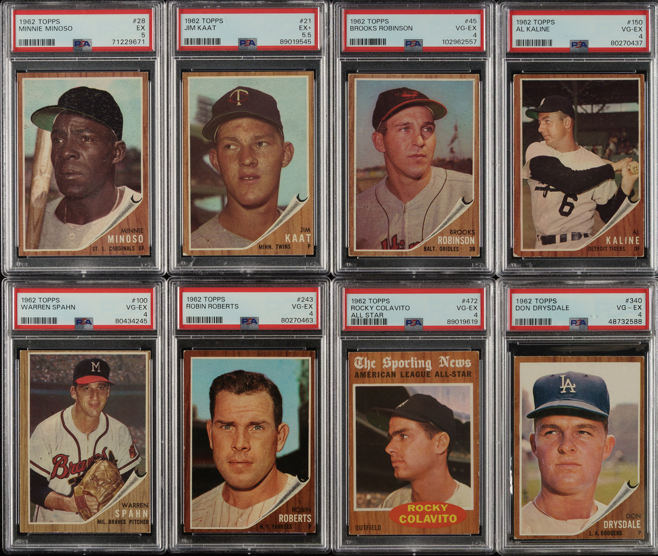 Collection of twelve 1962 Topps Hall of Famers and stars, each professionally graded and encapsulated by PSA. This collection consists of the following: PSA Grading Composite: EX 5 (4 cards): #21 Kaat (EX+ 5.5), 28 Minoso, 30 Mathews, and 399 Spahn AS. VG-EX 4 (7 cards): #45 B. Robinson, 100 Spahn, 150 Kaline, 243 Roberts, two 340 Drysdale (one VG-EX+ 4.5), and 472 Colavito AS. GOOD 2 (1 card): #5 Koufax. Total: 12 cards. The size/weight of this item requires that there will be an additional shipping charge for this lot.
