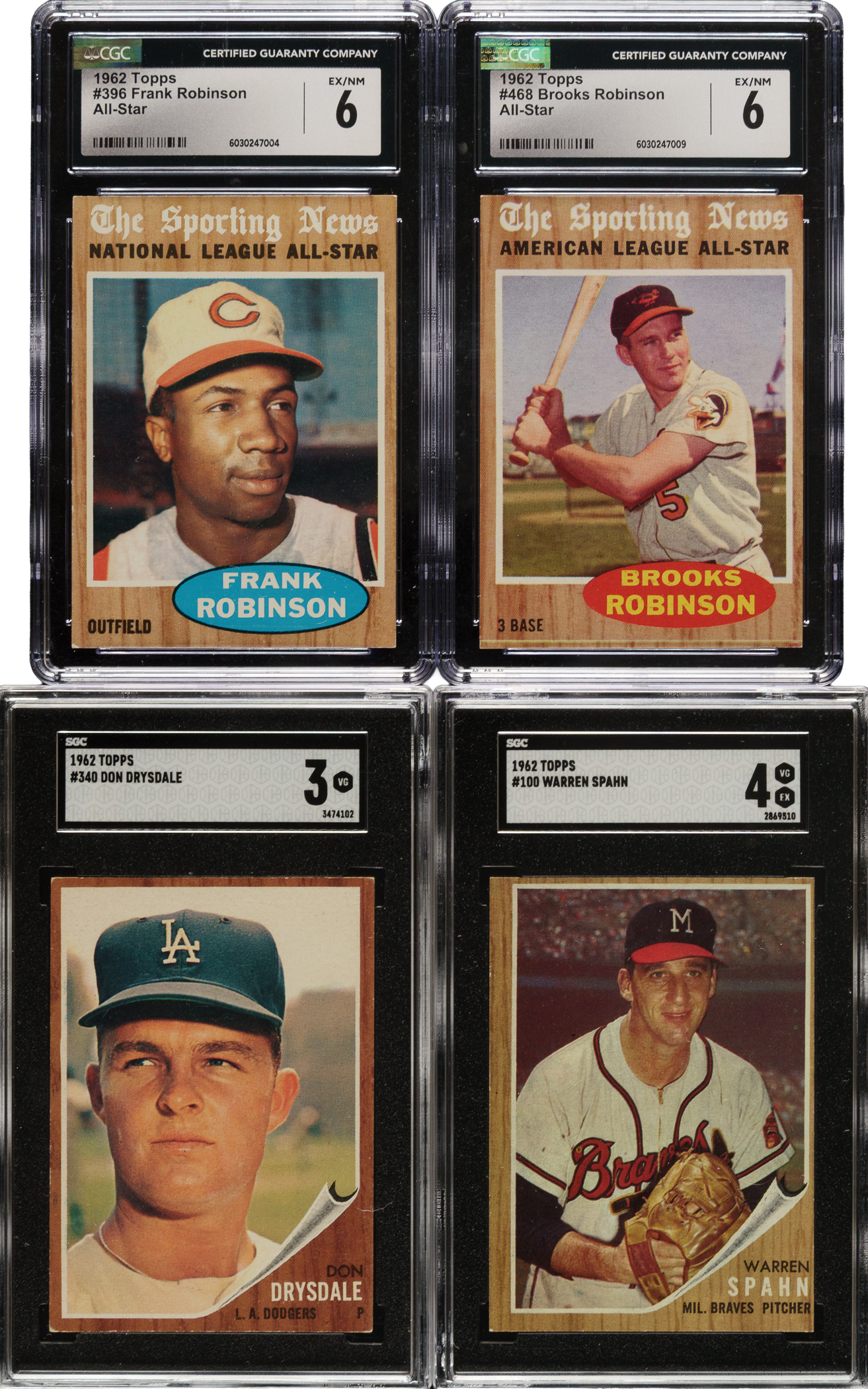 Collection of twelve 1962 Topps Hall of Famer baseball cards, each professionally graded and encapsulated by CGC (6) and SGC (6). This collection consists of the following: #40 Cepeda (SGC EX/NM 6), 100 Spahn (SGC VG/EX 4), 235 WS Gm. 4 - Ford (SGC NM 84), 315 Ford Tosses a Curve (SGC NM+ 86), 340 Drysdale (SGC VG 3), 390 Cepeda AS (CGC VG/EX+ 4.5), two 396 F. Robinson AS (CGC EX/NM+ 6.5 and CGC EX/NM 6), 398 Drysdale AS (SGC NM+ 86), two 468 B. Robinson AS (CGC EX/NM 6 and CGC EX+ 5.5), and 469 Aparicio AS (CGC EX/NM 6). Total: 12 cards. The size/weight of this item requires that there will be an additional shipping charge for this lot.