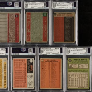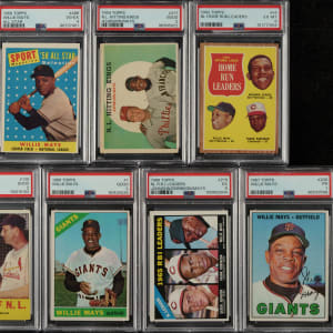 Collection of seven 1958 to 1967 Topps Willie Mays baseball cards, each professionally graded and encapsulated by PSA. This collection consists of the following: 1) 1958 Topps (1 card): #486 Mays AS (VG-EX 4). 2) 1959 Topps (1 card): #317 Ashburn/Mays (GOOD 2). 3) 1962 Topps (1 card): #54 NL HR Ldrs w/ Mays and F. Robinson (EX-MT 6). 4) 1963 Topps (1 card): #138 Mays/Musial (GOOD 2). 5) 1966 Topps (2 cards): #1 Mays (GOOD 2) and 219 NL RBI Ldrs w/ Mays and F. Robinson (EX 5). 6) 1967 Topps (1 card): #200 Mays (POOR 1). Total: 7 cards.