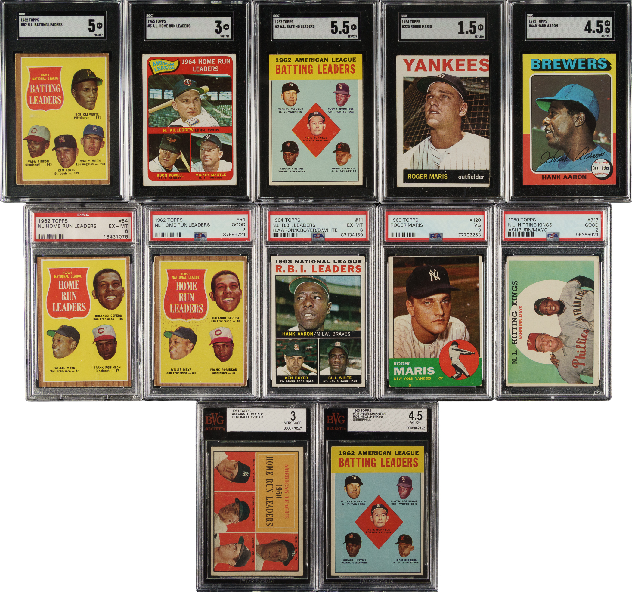 Collection of sixteen 1958 to 1975 Topps Hall of Famers and stars, each professionally graded and encapsulated by PSA (8), BVG (2), CGC (1), and SGC (5). This collection includes xx Hall of Famers and is highlighted by Hank Aaron, Mickey Mantle, and Willie Mays. This collection consists of the following: 1) 1958 (1 card): #488 Aaron AS (VG-EX 4). 2) 1959 (1 card): #317 NL Hitting Kings (Ashburn/Mays, GOOD 2). 3) 1961 (1 card): #44 AL HR Ldrs w/ Mantle and Maris (BVG VG 3). 4) 1962 (5 cards): #52 NL Batting Ldrs w/ Clemente (SGC EX 5), 53 AL HR Ldrs w/ Mantle and Killebrew (CGC EX/NM 6), two 54 NL HR Ldrs w/ Mays and F. Robinson (EX-MT 6 and GOOD 2), and 401 Maris/Cepeda (NM 7 [MC]). 5) 1963 (3 cards): Two #2 AL Batting Ldrs w/ Mantle (SGC EX+ 5.5 and BVG VG-EX+ 4.5 and 120 Maris (VG 3). 6) 1964 (2 cards): #11 NL RBI Ldrs w/ Aaron (EX-MT 6) and 225 Maris (SGC FAIR 1.5). 7) 1965 (1 card): #3 AL HR Ldrs w/ Killebrew and Mantle (SGC VG 3). 8) 1967 (1 card): #200 Mays (GOOD 2). 9) 1975 (1 card): #660 Aaron (SGC VG/EX+ 4.5). Total: 16 cards. The size/weight of this item requires that there will be an additional shipping charge for this lot.