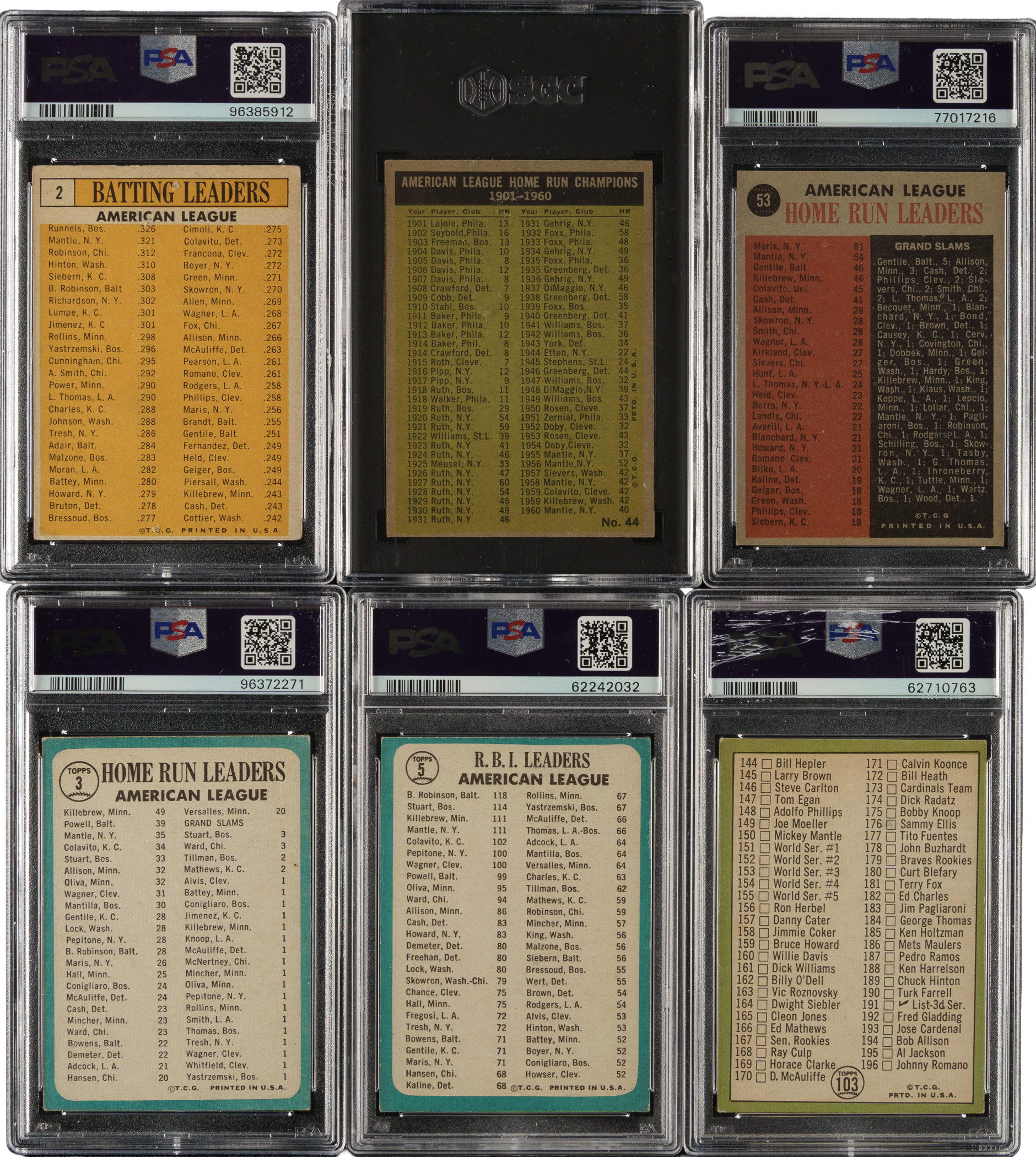 Collection of six 1961 to 1967 Topps Mickey Mantle baseball cards, each professionally graded and encapsulated by PSA () and SGC (). This collection consists of the following: 1) 1961 (1 card): #44 AL HR Ldrs w/ Mantle (SGC EX 5). 2) 1962 (1 card): #53 AL HR Ldrs w/ Mantle (EX 5). 3) 1963 (1 card): #2 AL Batting Ldrs w/ Mantle (POOR 1). 4) 1965 Topps (2 cards): #3 AL HR Ldrs w/ Mantle and Killebrew (VG+ 3.5) and 5 AL RBI Ldrs w/ Mantle and B. Robinson (VG 3). 5) 1967 (1 card): #103 Checklist 110-196 w/ Mantle (VG 3). Total: 6 cards.