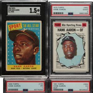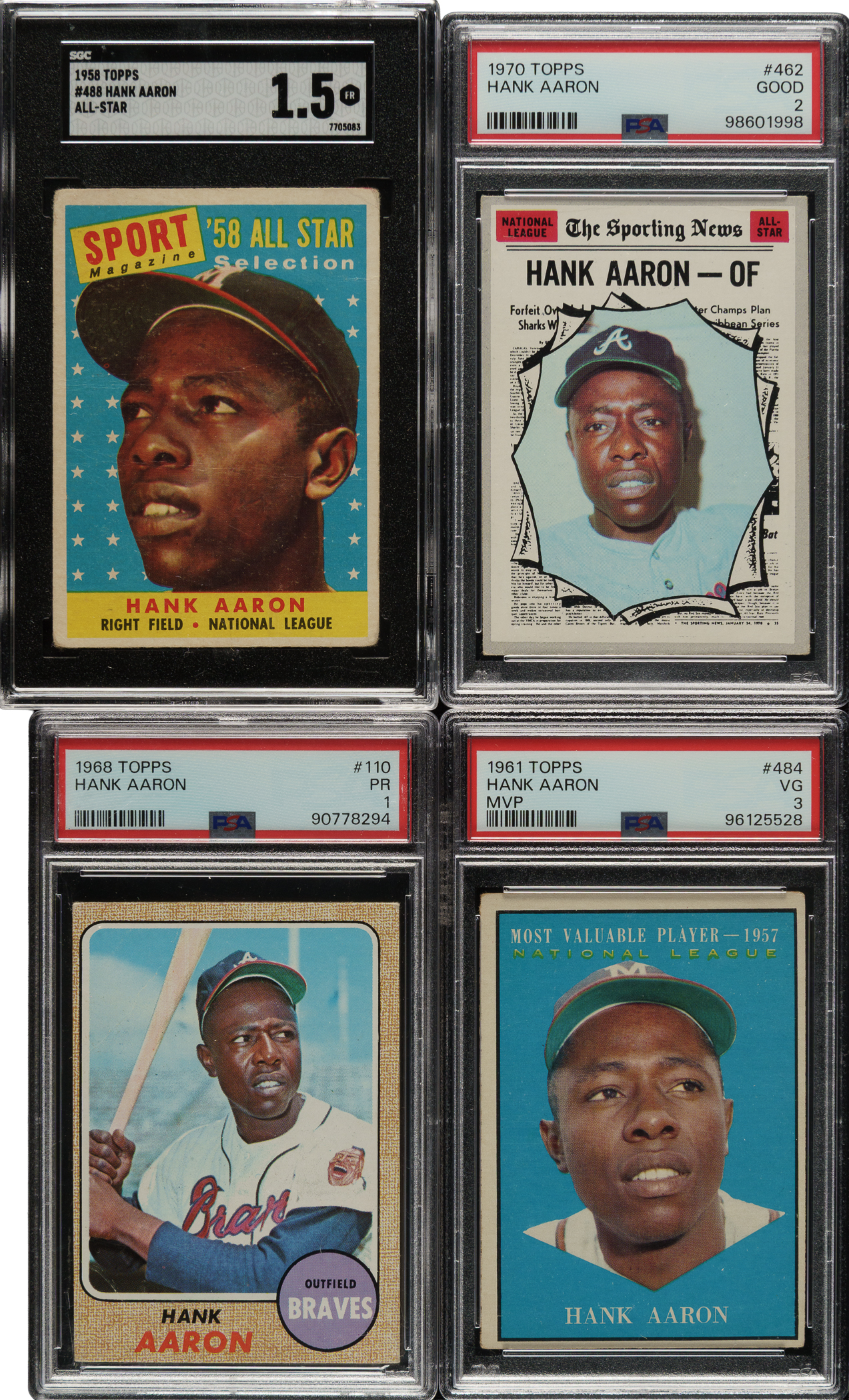 Collection of thirteen 1958 to 1975 Topps Hank Aaron baseball cards, each professionally graded and encapsulated by PSA (9), CGC (1), and SGC (3). This collection consists of the following: 1) 1958 (1 card): #488 Aaron AS (SGC FAIR 1.5). 2) 1958 (1 card): #467 Aaron Clubs Homer (SGC POOR 1). 3) 1961 (2 cards): #43 NL HR Ldrs w/ Aaron and Banks (VG-EX 4) and 484 Aaron MVP (VG 3). 4) 1964 (3 cards): #9 NL HR Ldrs w/ Aaron and Mays (VG-EX 4), 11 NL RBI Ldrs w/ Aaron (VG 3), and 300 Aaron (POOR 1). 5) 1967 (1 card): #244 NL HR Ldrs w/ Aaron and Mays (VG 3). 6) 1968 (1 card): #110 Aaron (POOR 1). 7) 1970 (2 cards): #462 Aaron AS (GOOD 2) and 500 Aaron (CGC VG+ 3.5). 8) 1971 (1 card): #400 Aaron (VG 3). 9) 1975 (1 card): #660 Aaron (SGC VG/EX 4). Total: 13 cards. The size/weight of this item requires that there will be an additional shipping charge for this lot.
