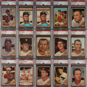 Collection of twenty-two 1962 Topps baseball cards, each professionally graded and encapsulated by PSA. This collection includes six Hall of Famers and is highlighted by Don Drysdale, Casey Stengel, and Bill Mazeroski. This collection consists of the following: PSA Grading Composite: NM-MT 8 (1 card): #86. NM 7 (10 cards): #23, 29 Stengel, 39, 62, 71, 80, 99 Powell RC, 108, 351, and 398 Drysdale AS (NM+ 7.5). EX-MT 6 (11 cards): #65 Richardson, 340 Drysdale, 351, 353 Mazeroski, two 398 Drysdale AS, 408, 430 Kubek, 542, 561, and 596. Total: 22 cards. The size/weight of this item requires that there will be an additional shipping charge for this lot.