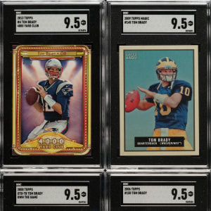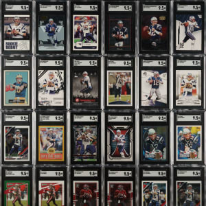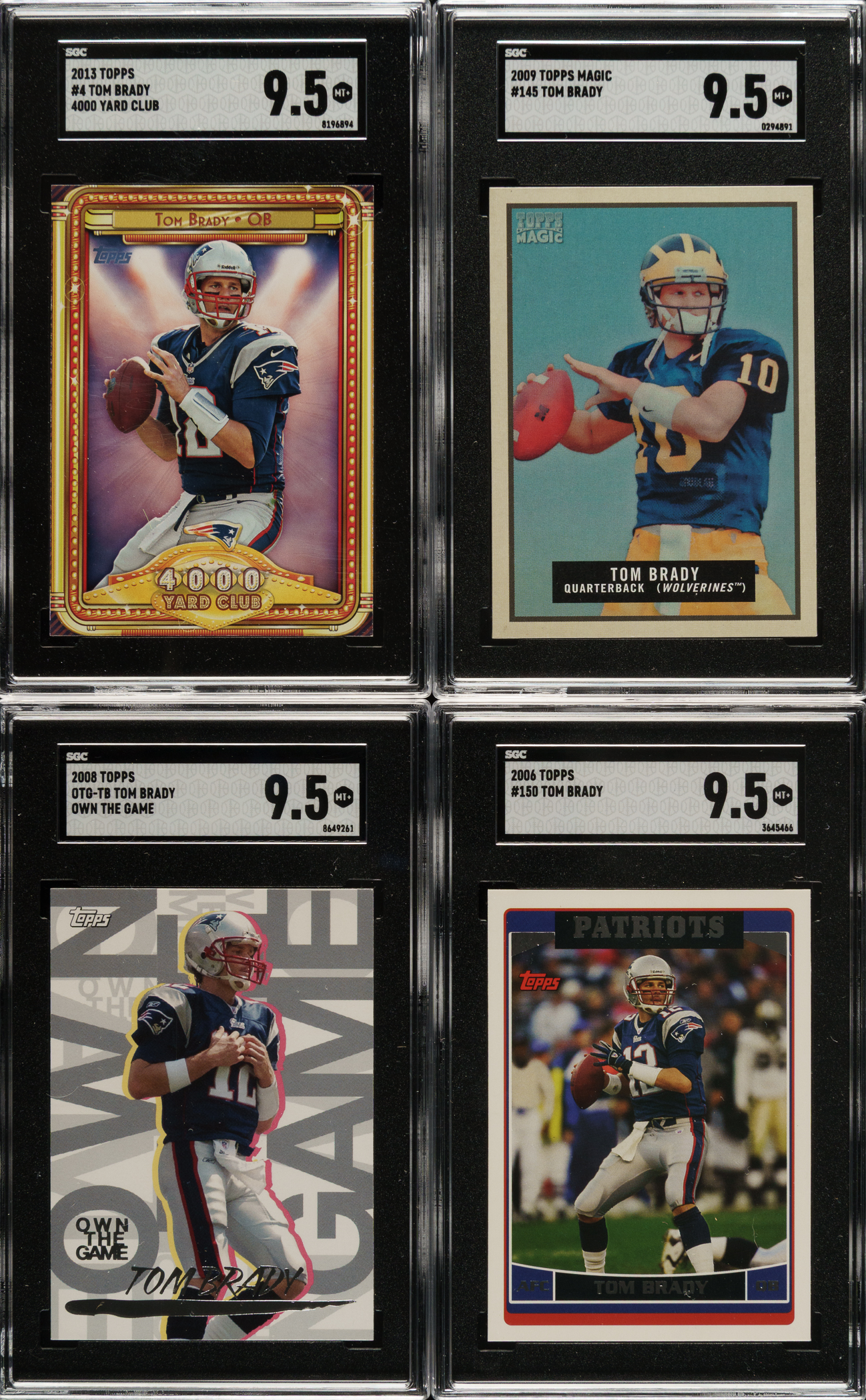 Collection of twenty-eight 2005 to 2021 Topps, Upper Deck and Donruss cards, featuring New England Patriots Star Tom Brady. Each card has been graded and encapsulated MINT+ 9.5 by SGC. This collection consists of the following: 1) 2005 Upper Deck Rookie Debut (1 card): #57. 2) 2006 Topps (1 card): #150. 3) 2006 Leaf Certified Materials (1 card): #86. 4) 2006 Fleer (1 card): #57. 5) 2007 Bowman Chrome (1 card): BC172. 6) 2008 Donruss Gridiron Gear (1 card): #58. 7) 2008 Topps Own the Game (1 card): #OTG-TB. 8) 2008 Upper Deck SP Authentic (1 card): #7. 9) 2009 Topps Magic (2 cards): Two #145. 10) 2009 Donruss Rookies & Stars (1 card): #59. 11) 2009 Donruss Elite (1 card): #57. 12) 2009 Upper Deck SP Authentic (1 card): #21. 13) 2009 Topps (1 card): #115. 14) 2009 Topps Topps Town (1 card): #TTT17/Silver. 15) 2010 Topps (1 card): #30. 16) 2010 Topps Chrome (1 card): #C80. 17) 2012 Topps Strata Retail (1 card): #100. 18) 2013 Topps 4,000 Yard Club (1 card): #4. 19) 2015 Topps Chrome (1 card): #50. 20) 2017 Panini Classics Super Bowl Heroes (1 card): #SBH-TB2/Gold. 21) 2019 Donruss Optic (2 cards): Two #63. 22) 2019 Donruss (1 card): 162. 23) 2020 Donruss Optic (2 cards): Two #92. 24) 2021 Donruss (1 card): #1. 25) 2021 Donruss Green Press Proof (1 card): #1. Total: 28 cards. The size/weight of this item requires that there will be an additional shipping charge for this lot.