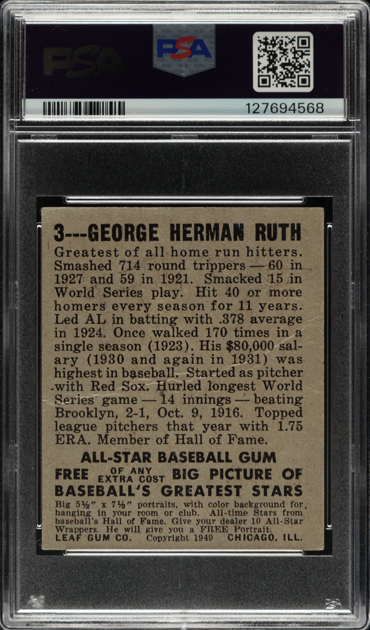 Graded FAIR 1.5 by PSA. New York Yankees Hall of Famer Babe Ruth.