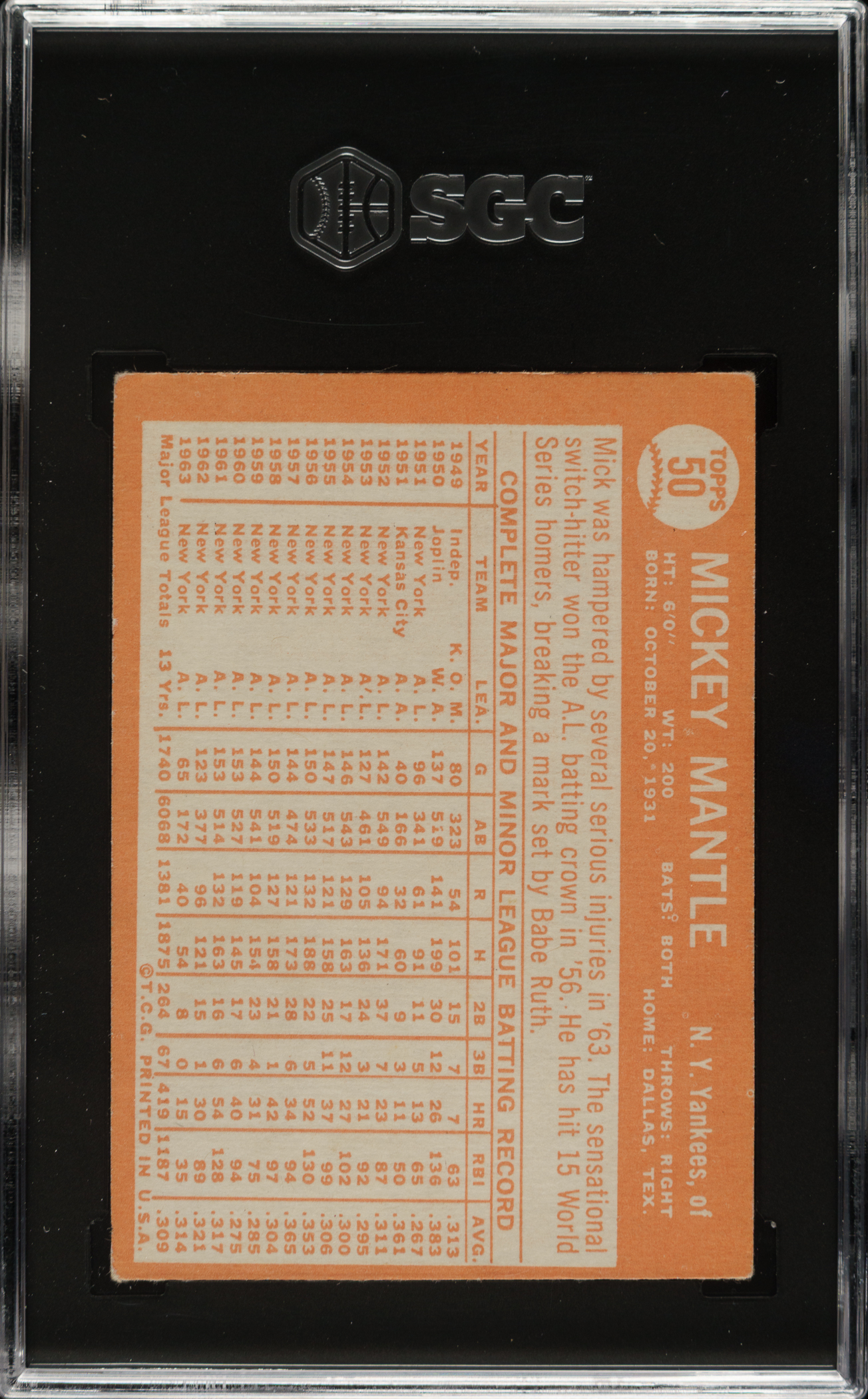 Lot # 3011: 1964 Topps #50 Mickey Mantle SGC GOOD 2