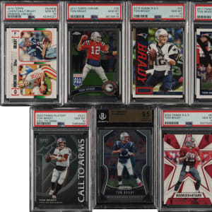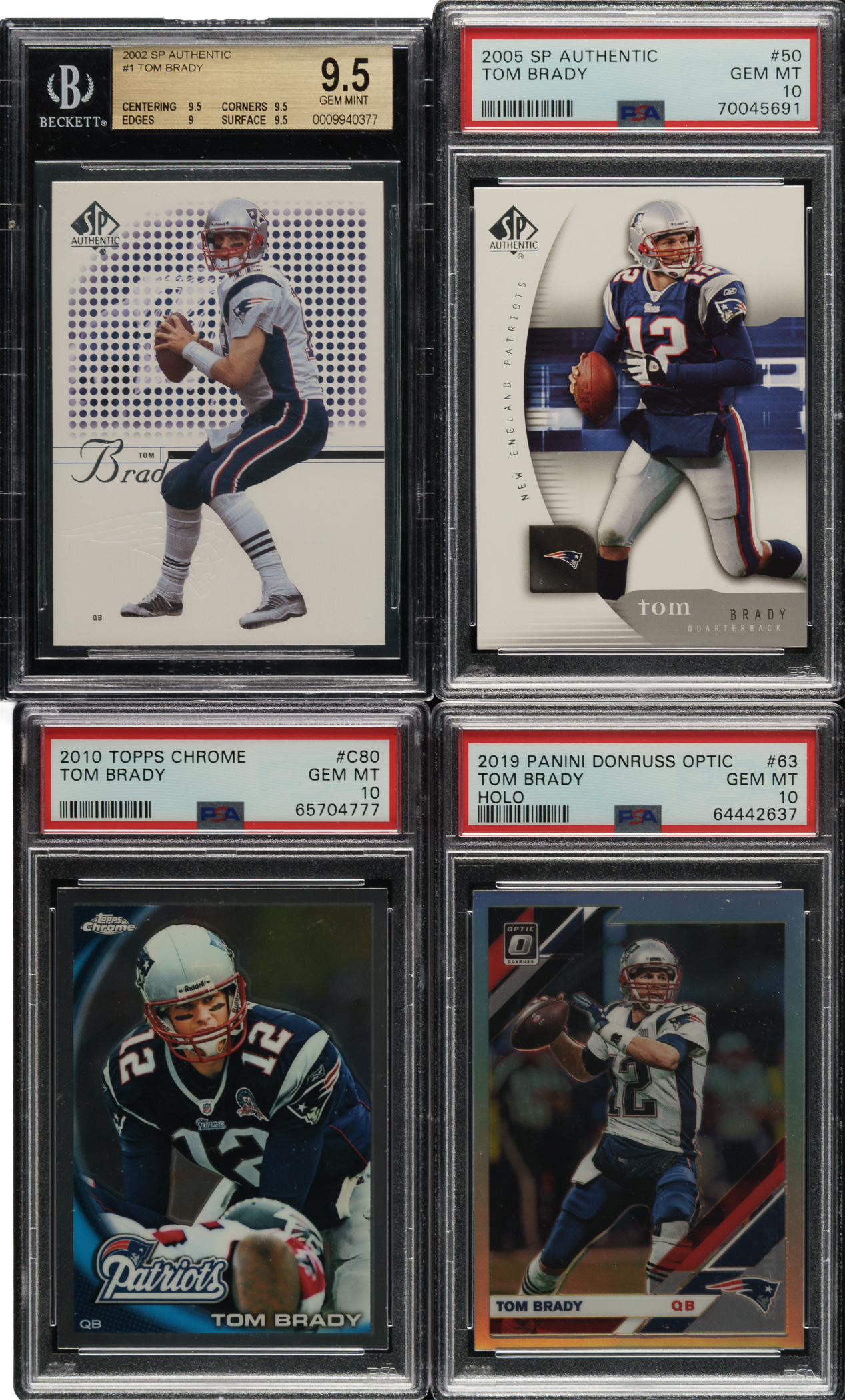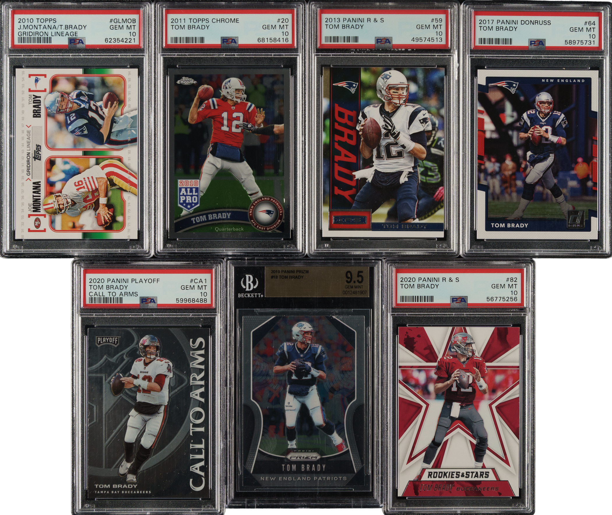 Collection of eleven 2002 to 2020 Topps, Upper Deck and Panini cards, featuring New England Patriots Star Tom Brady. Each card has been graded and encapsulated by PSA and BVG. This collection consists of the following: 1) 2002 Upper Deck SP Authentic (1 card): #1 (BVG (GEM MINT 9.5). 2) 2005 Upper Deck SP Authentic (1 card): #50 (GEM MINT 10). 3) 2010 Topps Gridiron Lineage (1 card): #GLMOB Montana/Brady (GEM MINT 10). 4) 2010 Topps Chrome (1 card): #C80 (GEM MINT 10). 5) 2011 Topps Chrome (1 card): #20 (GEM MINT 10). 6) 2013 Panini Rookie & Stars (1 card): #59 (GEM MINT 10). 7) 2017 Panini Donruss (1 card): #64 (GEM MINT 10). 8) 2019 Panini Prizm (1 card): #18 (BVG GEM MINT 9.5). 9) 2019 Panini Donruss Optic (1 card): #63/Holo (GEM MINT 10). 10) 2020 Panini Playoff Call to Arms (1 card): #CA-1 (GEM MINT 10). 11) 2020 Panini Rookie & Stars (1 card): #82 (GEM MINT 10). Total: 11 cards. The size/weight of this item requires that there will be an additional shipping charge for this lot.