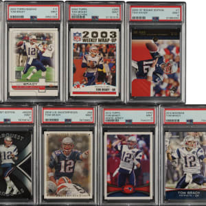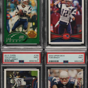 Collection of thirteen 2002 to 2013 Topps and Upper Deck cards, featuring New England Patriots Star Tom Brady. Each card has been graded and encapsulated by PSA. This collection consists of the following: 1) 2002 Upper Deck (1 card): #195 (MINT 9). 2) 2002 Pacific Private Stock Titanium Shadows (1 card): #7 (Authentic). 3) 2002 Topps (1 card): #295 (MINT 9). 4) 2002 Topps Reserve (1 card): #17 (MINT 9). 5) 2004 Topps Collection (1 card): #299 (MINT 9). 6) 2008 Upper Deck SP Rookie Edition (1 card): #7 (MINT 9). 7) 2008 Upper Deck Starquest (1 card): #SQ29/Rainbow red (MINT 9). 8) 2008 Upper Deck First Edition Starquest (1 card): #SQ29 (MINT 9). 9) 2008 Upper Deck Masterpieces (1 card): #84 (MINT 9). 10) 2012 Topps (2 cards): Two #440/White jersey (MINT 9). 11) 2012 Bowman (1 card): #50 (MINT 9). 12) 2013 Topps (1 card): #100/White jersey (MINT 9). Total: 13 cards. The size/weight of this item requires that there will be an additional shipping charge for this lot.