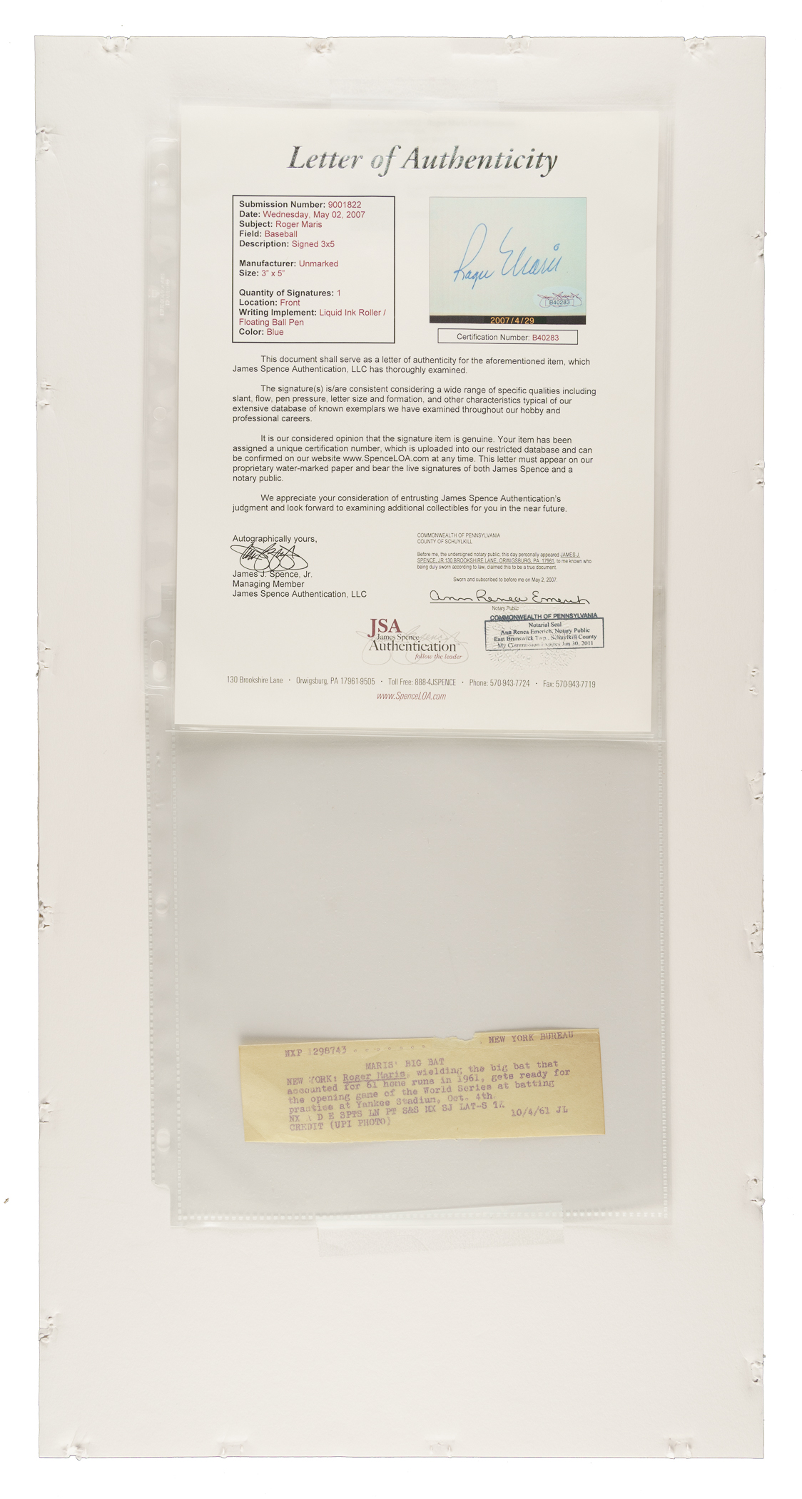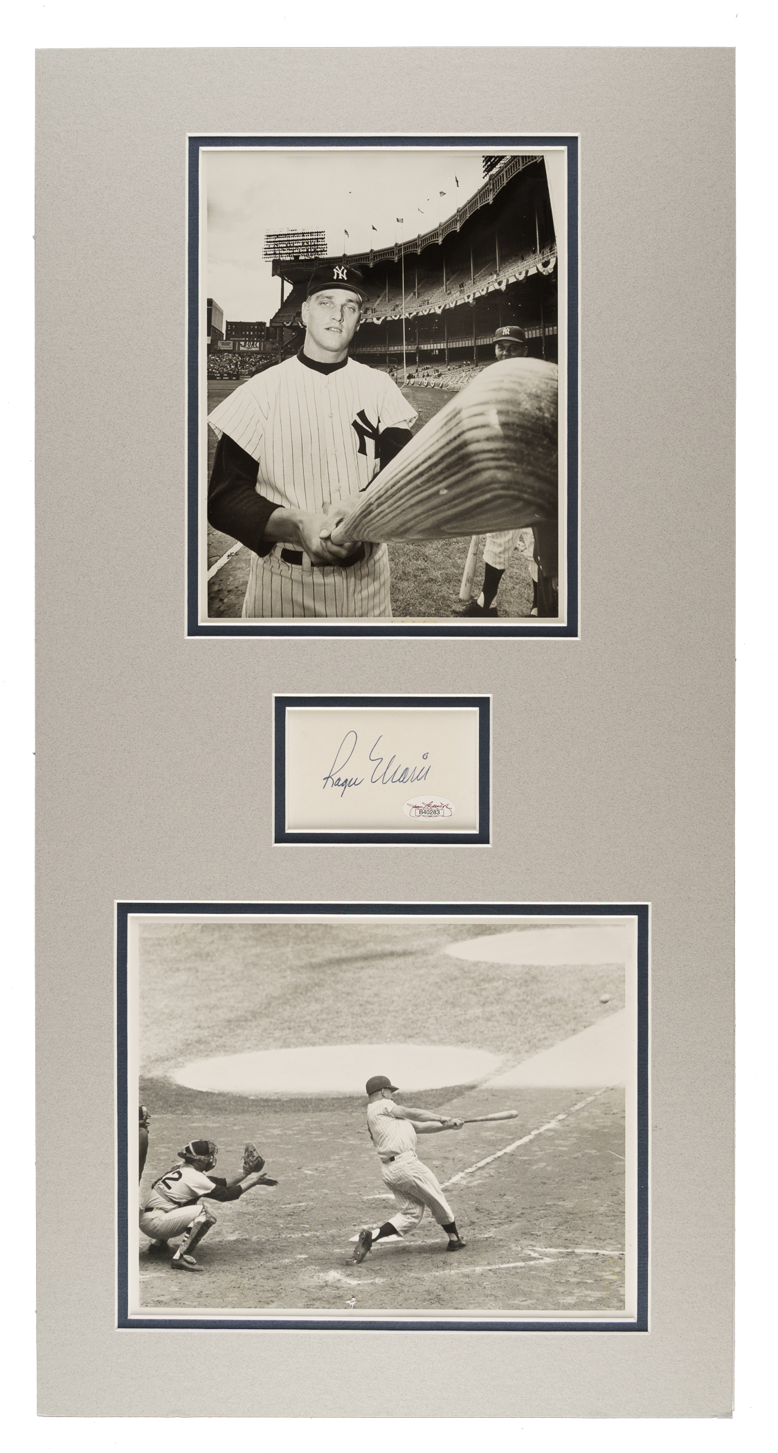Presented is a cut signature of Roger Maris. Maris' signature has been executed in blue ink. The cut has been matted together with a pair of vintage photos of Maris from the 1961 season (the top photo's original news caption is included in the lot). The cut (3 x 5 inches; visible dimensions) is in apparent Near Mint condition overall. Matted to total dimensions of 13 x 25 inches. Full LOA from James Spence/JSA. The size/weight of this item requires that there will be an additional shipping charge for this lot.