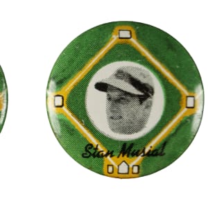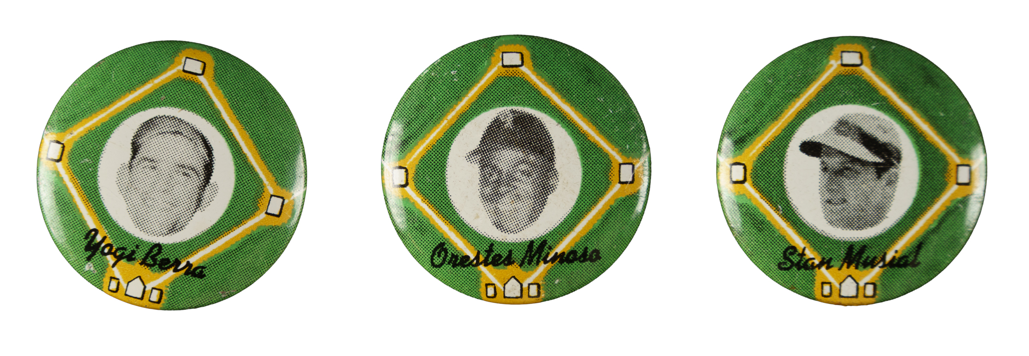 Collection of three 1956 PM15 "Yellow Basepath" pins. This collection consists of the following: Berra (Ex), Minoso (Ex), and Musial (Ex). Total: 3 pins.