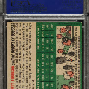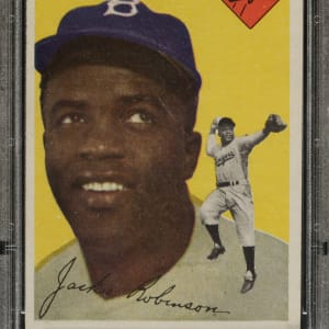 Graded NM 7 by PSA. High-grade example of Brooklyn Dodgers Hall of Famer Jackie Robinson’s 1954 Topps card. Bright, crisp, and clean with brilliant colors and strong corners. Clean reverse. One of Robinson's most popular cards, this is a fantastic example worthy of any 1954 Topps or Jackie Robinson collection.