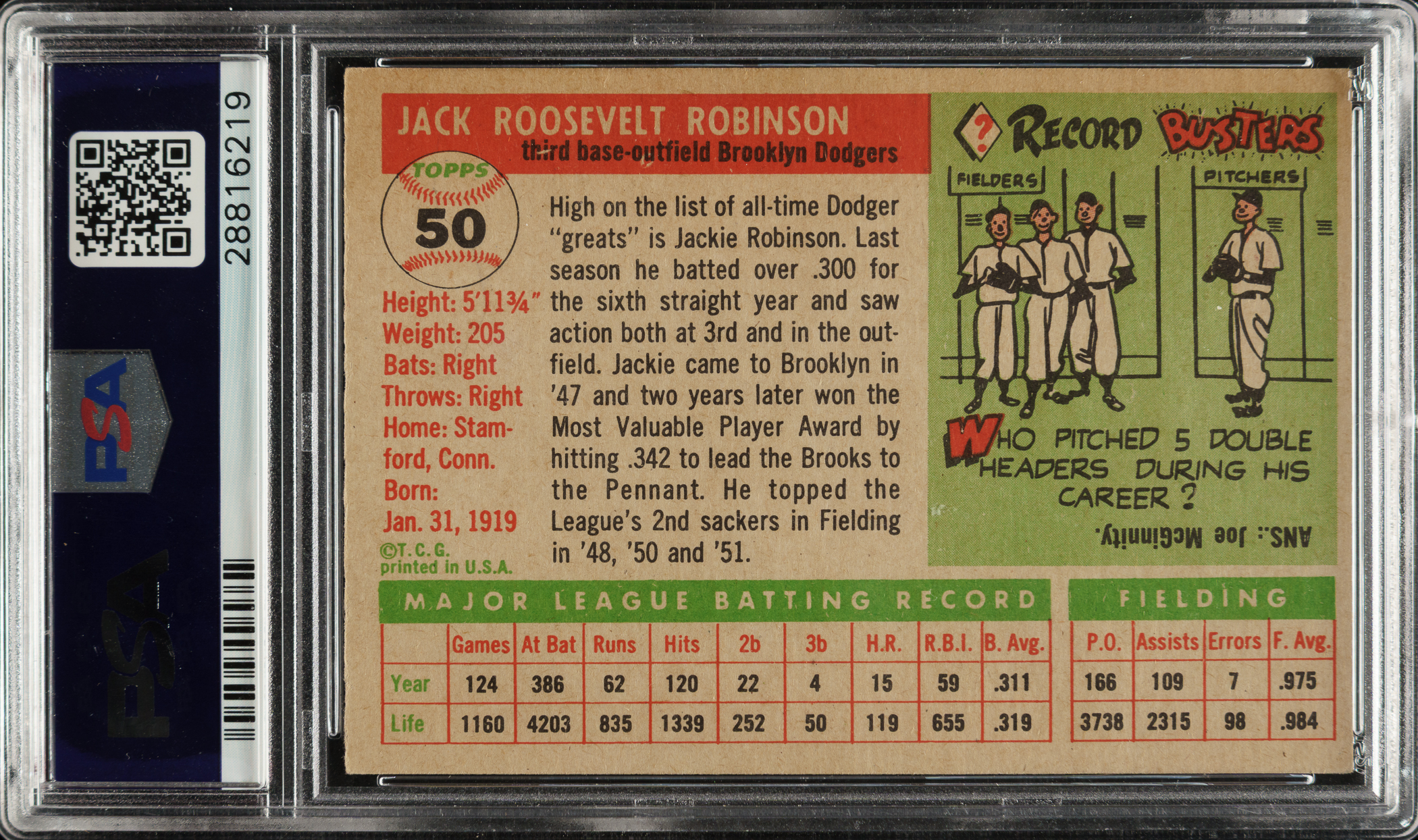Graded NM 7 by PSA. Beautiful high-grade example of Brooklyn Dodgers Hall of Famer Jackie Robinson from the 1955 Topps set. This card has bright colors, outstanding registration, and strong corners. Clean reverse. This is a fantastic high-grade example of one of the most popular of all Jackie Robinson cards.