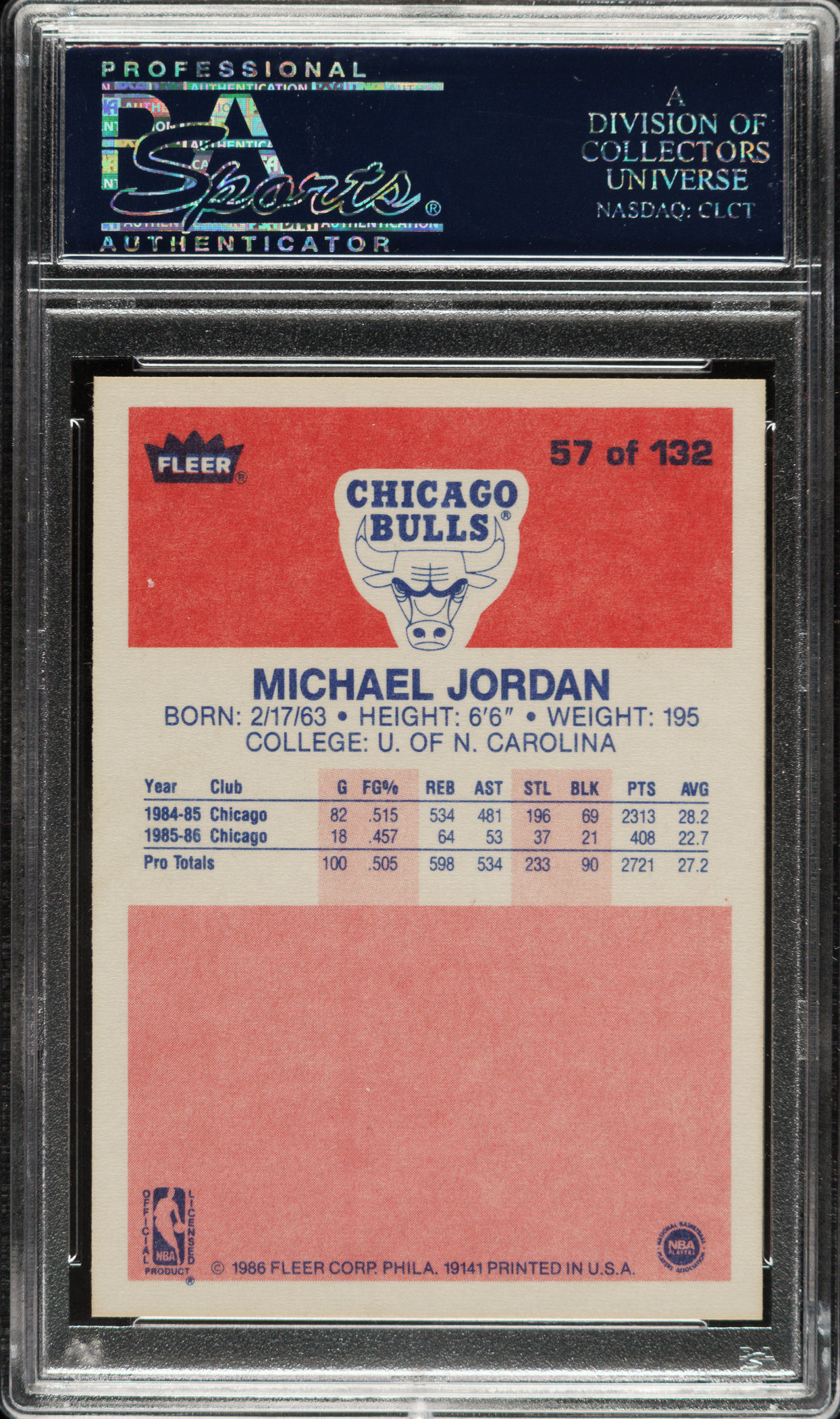 Graded MINT 9 by PSA. Tremendous ultra-high-grade rookie card of Chicago Bulls Hall of Famer Michael Jordan, arguably the greatest basketball player ever. This is a stunning example of the premier modern-day basketball card. The 1986-1987 Fleer basketball issue is extremely condition sensitive due to its blue-and-red flush-to-the-border design. The offered card boasts superb image quality, virtually no chipping to the extreme edges of the condition-sensitive borders, and sharp corners. The Fleer Jordan card is one of the cards that is recognizable to collectors of all ages and is one of the great collectibles in our hobby. A spectacular example of this most sought-after modern basketball-card classic in MINT condition.