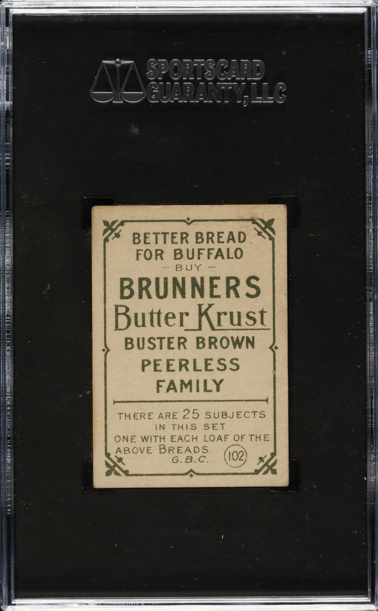 Graded VG+ 3.5 by SGC. Presented is the key Hall of Famer from the extremely rare 25-card D304 General Baking Co. brand bread series. This is one of Ty Cobb's rarest, most unusual, and most striking vintage cards. Issued by a bakery in the Buffalo, New York area, these cards are known to have five different back styles (Brunners, Butter Krust, General Baking Co., Weber Bakery, and Martens Bakery). Similar in design to tobacco and candy cards of the era, D304s measure slightly larger than T206s, at 1.75 x 2.5 inches, and while not “on the radar” of most collectors, they are actually considerably rarer than most 1910-era “E” and “T” card issues. The fronts feature very attractive full-color illustrations, each of which is unique to this issue. In recent years, collectors have shown a growing appreciation for the mystique of the rarest vintage-card issues. D304s certainly fall into this category and have always been appreciated but are rarely offered. D304s were issued in 1911, 1912, 1913, and 1914. This is a very sharp-looking card in all respects with extraordinary eye appeal and it is well-centered with brilliant colors, outstanding registration, and honest corner wear. The back of the card features advertising for Butter Krust brand bread, which is boldly printed in green. A light corner crease in the lower left contributes to the assigned grade. This is an outstanding, technically mid-grade example of one of Ty Cobb’s and all of card collecting's rarest, most majestic, and revered prewar cards. Awarded an MBA Silver Diamond by Mike Baker Authenticated for high-end eye appeal. A corresponding MBA sticker is affixed to the front of the holder.