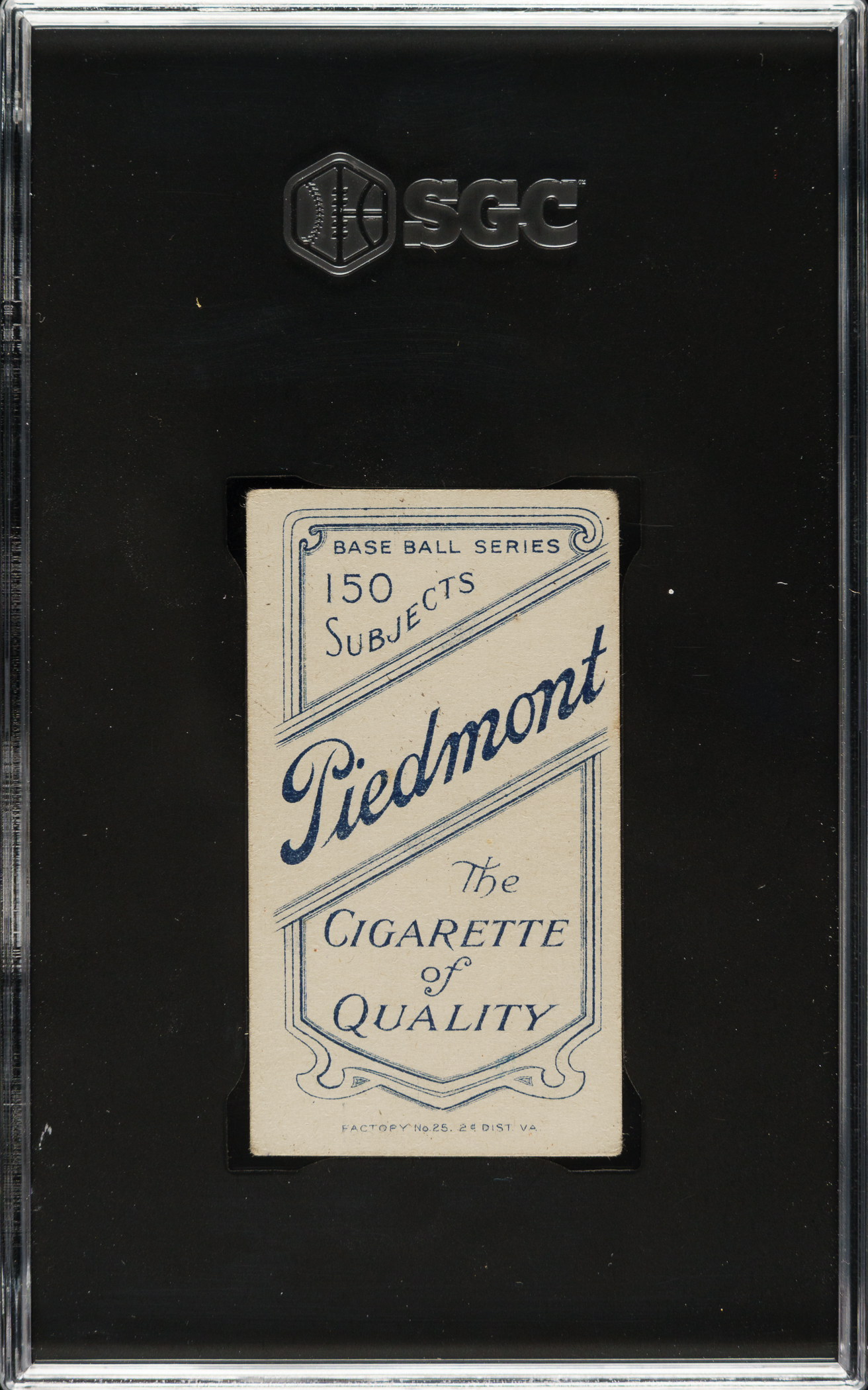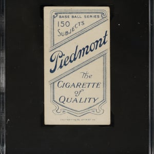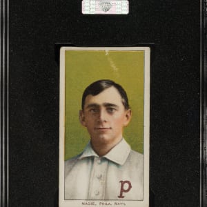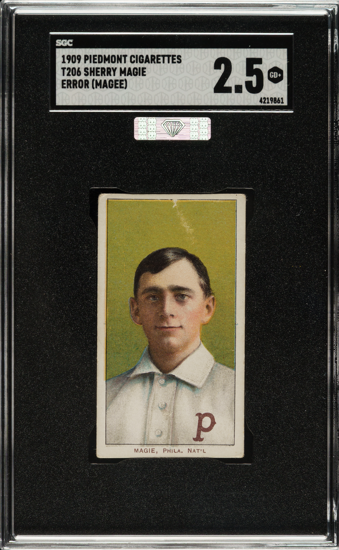 Graded GOOD+ 2.5 by SGC. A very presentable mid-grade example of the famous T206 Magie error card. Magie is one of the rarest T206 cards and, along with Plank, Wagner, and the rare Doyle, is usually one of the last cards required by collectors to complete the set. The Magie error card has been recognized as one of card collecting's great rarities since the days of Jefferson Burdick. (In fact, Burdick singled out the Magie as one of the significant T206 rarities in the original American Card Catalog.) The offered card has vibrant colors, a crisp image, honest corner wear, and a small area of surface wear at the top. Boldly printed Piedmont 150 advertising reverse. This is an extremely pleasing example of one of card collecting's most significant rarities. Awarded an MBA Silver Diamond by Mike Baker Authenticated for high-end eye appeal. A corresponding MBA sticker is affixed to the front of the holder.