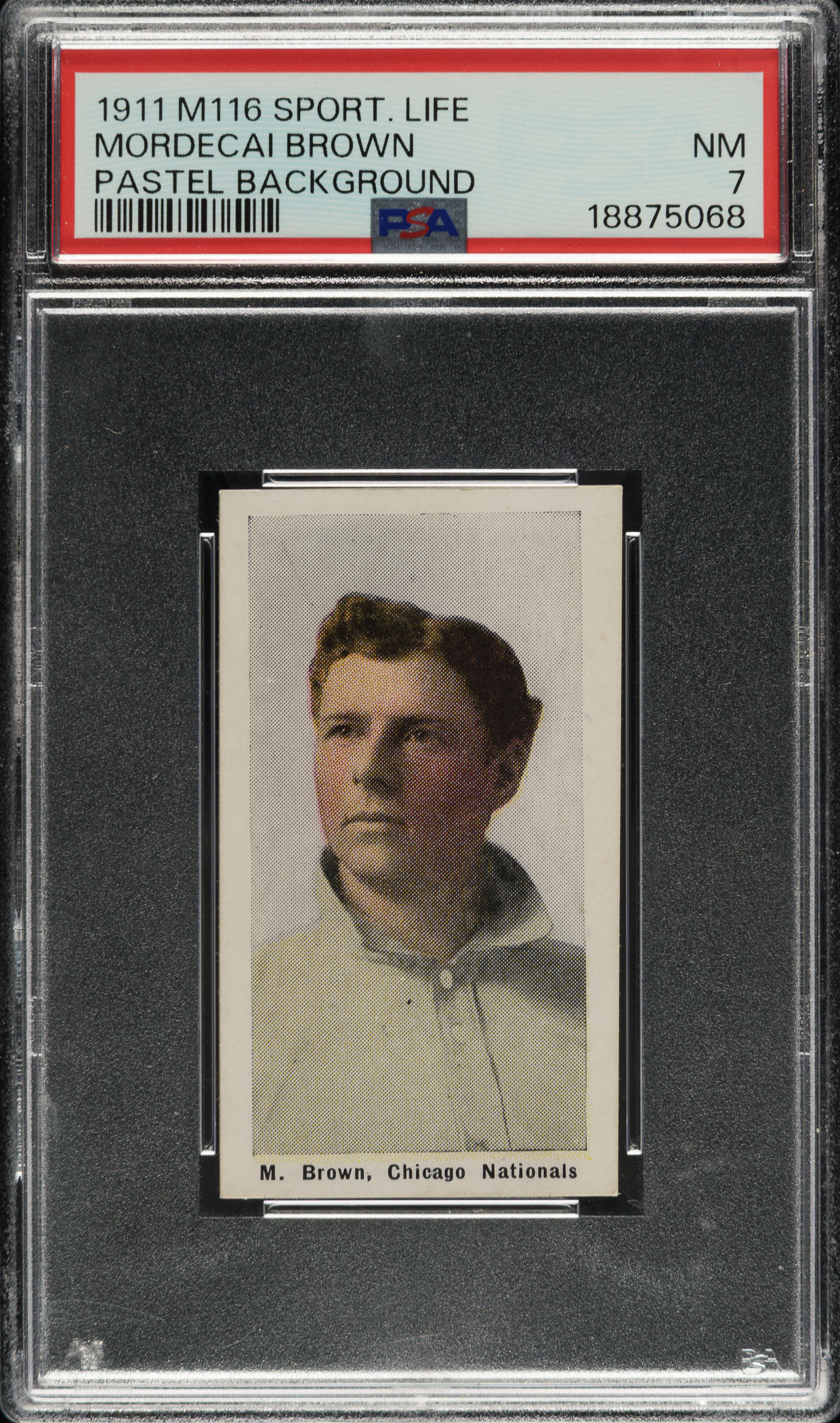 Graded NM 7 by PSA. Chicago Cubs Hall of Famer Mordecai Brown. One of three examples graded at this level by PSA with none higher!