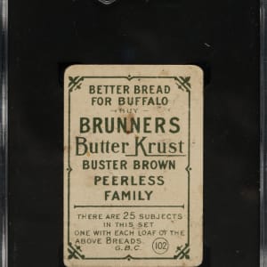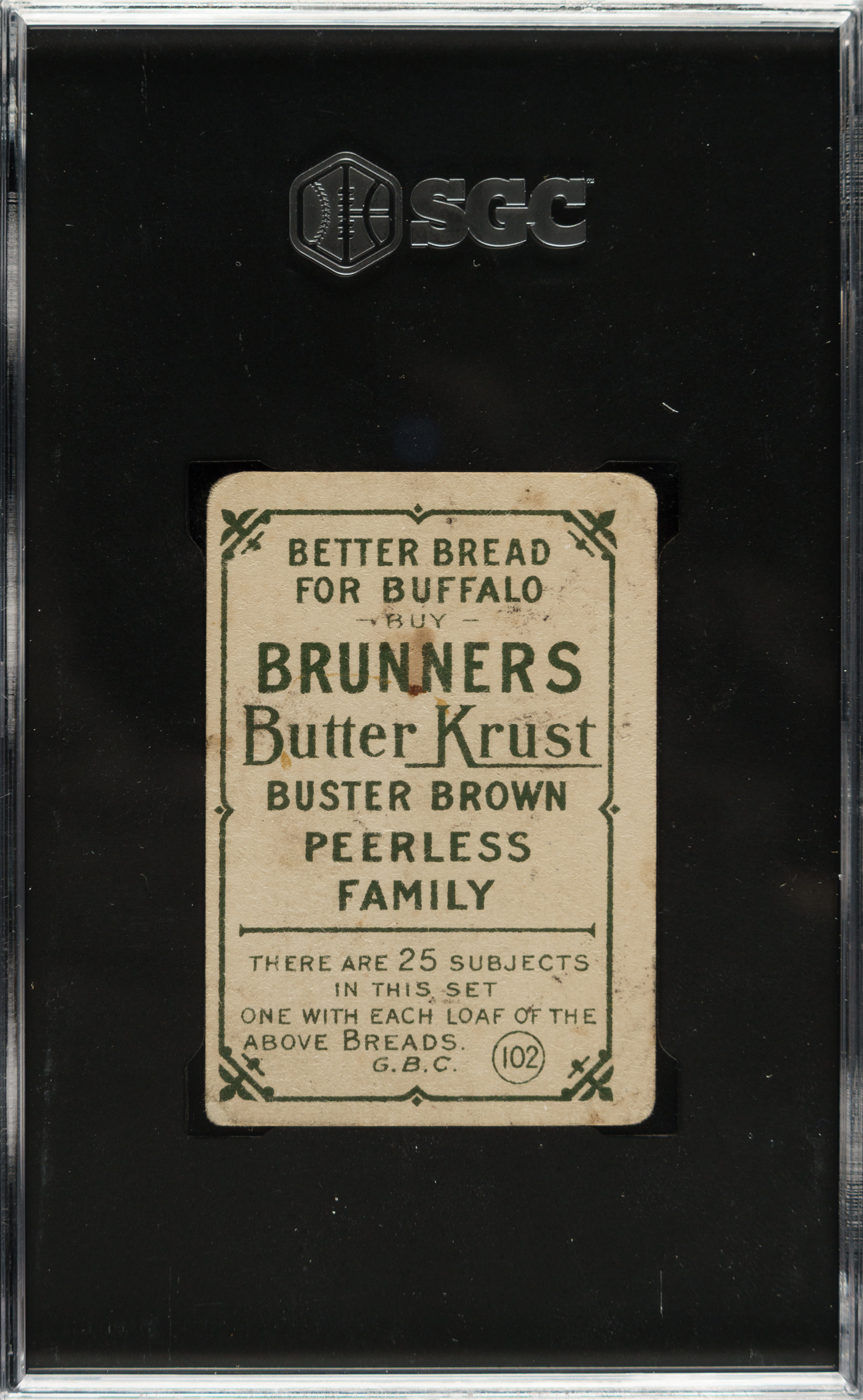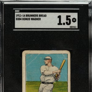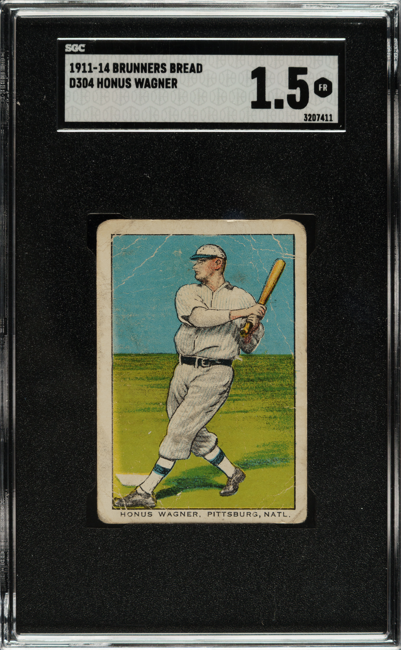 Presented is one of the key Hall of Famers from the extremely rare, 25-card D304 Brunners Butter Krust brand bread (General Baking Co.) series: Honus Wagner. This is one of Wagner's rarest, most unusual, and most striking vintage cards. Issued by a bakery in the Buffalo, New York area, these cards are known with five different back styles (Brunners, Butter Krust, General Baking Co., Weber Bakery, and Martens Bakery). Similar in design to tobacco and candy cards of the era, D304s measure slightly larger than T206s, at 1.75 x 2.5 inches. They are considerably rarer than most 1910-era “E” and “T” card issues. The fronts have attractive full-color illustrations, each of which is unique to this issue. The offered card has brilliant colors and a crisp image of Wagner. The back of the card has advertising for Brunners Butter Krust brand bread and is boldly printed in green. Graded FAIR 1.5 by SGC, condition flaws include heavy creasing, corner wear, and a small stain on the reverse.