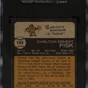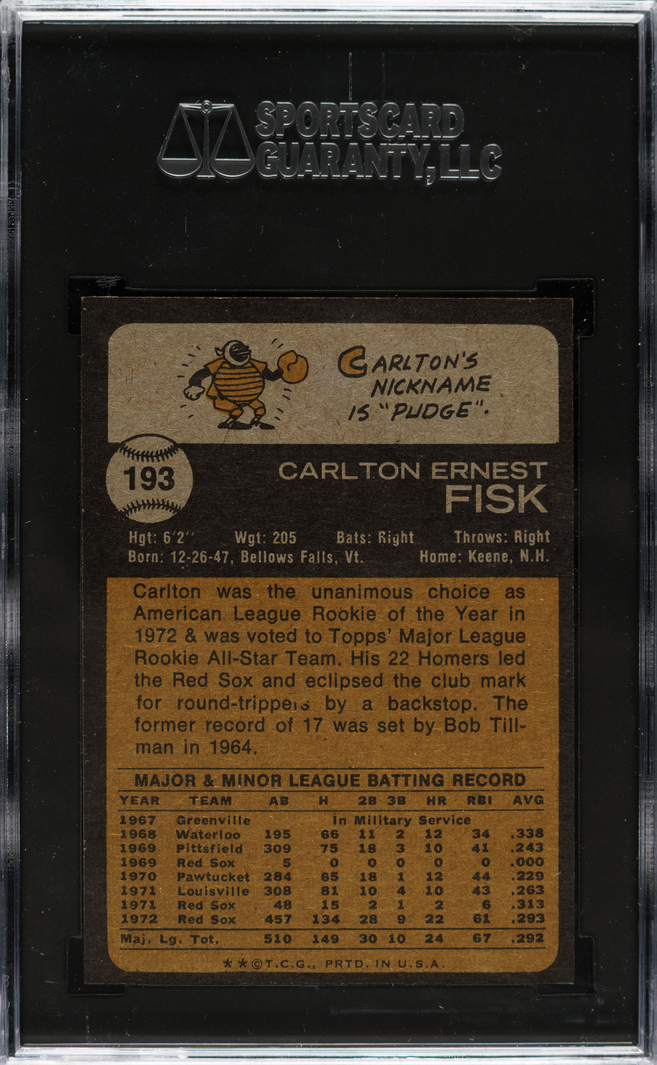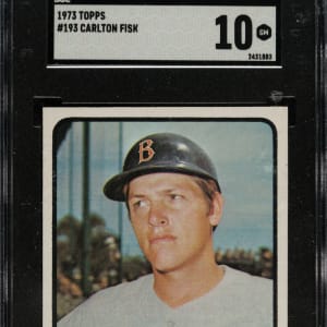 Graded GEM MINT 10 by SGC. This is the ONLY example ever to be graded at this level from among 608 cards evaluated by SGC to date. Exceptional ultra high-grade example of Boston Red Sox Hall of Famer Carlton Fisk (#193) from the 1973 Topps set. One of the key cards to the extremely popular 1970s Topps set, the offered card is bright, crisp, and clean, both front and back, with four sharp corners, brilliant colors, and near-perfect centering. An ideal example in unparalleled high-grade worthy of the finest 1973 Topps set or Carlton Fisk collection.